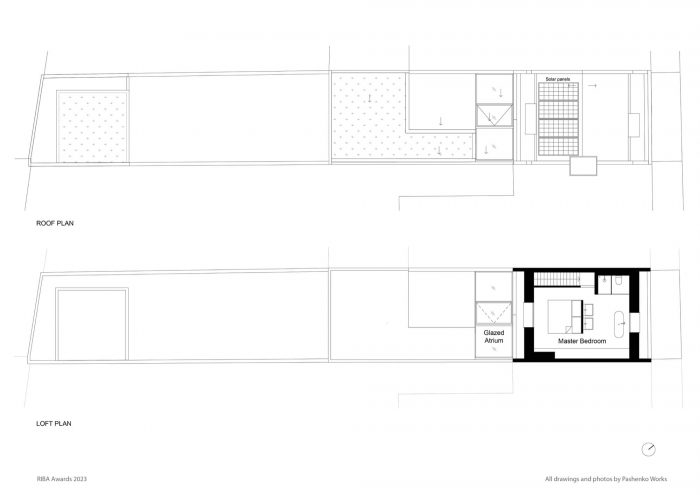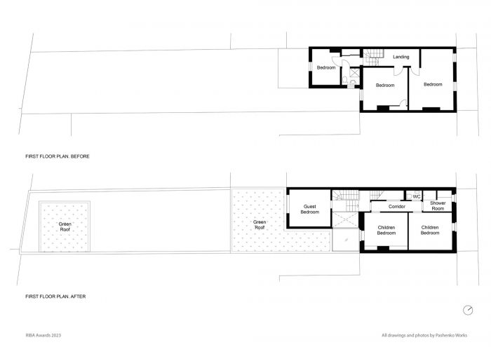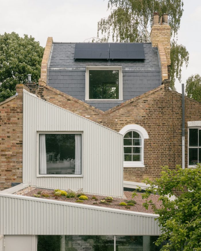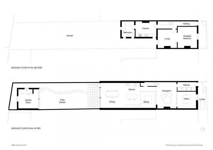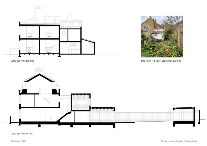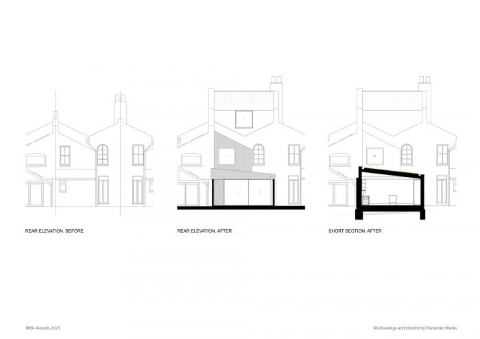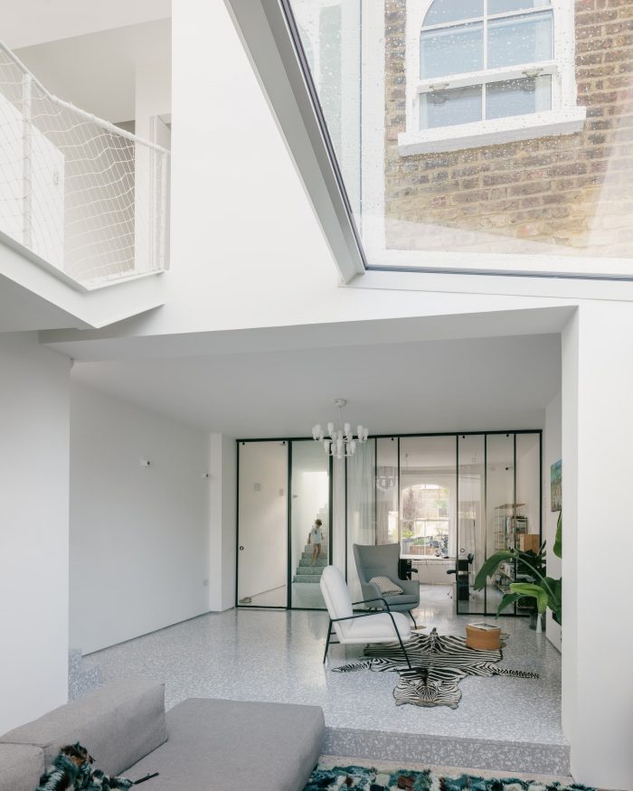 The project consists of five distinct parts which can be experienced in sequence when entering the building: 1. The original Victorian terrace facing Harbour Road; 2. A glass ‘bridge’ - atrium; 3. The new contemporary extensions at the ground and first levels; 4. A patio garden framed by: 5. a garden room at the opposite end of the site. The space sequence is thought through not only horizontally but also vertically. The ground floor is open, public, and noisy; the first floor is divided into rooms for guests and children. And the last top floor is a master bedroom on the newly added mansard roof – full of light and quiet at the end of destination traffic.