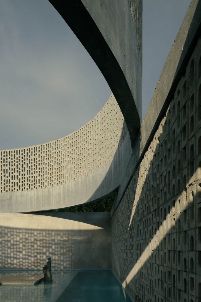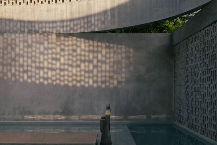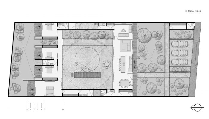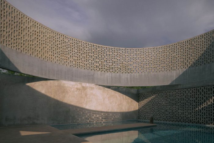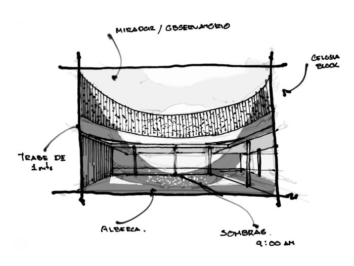 Taking advantage of the orientation of the plot, the function of the central cylinder is to allow the passage of light to the central space, where the pool is located, however, given its great camber, it provides the space with enough shade during sunrise and sunset to exempt the use of a roof on the terrace, allowing the space to be inhabited below shade most of the day. Its strategic location, right next to the interior social area, achieves the link between both spaces by opening all the sliding doors that separate the interior from the exterior.