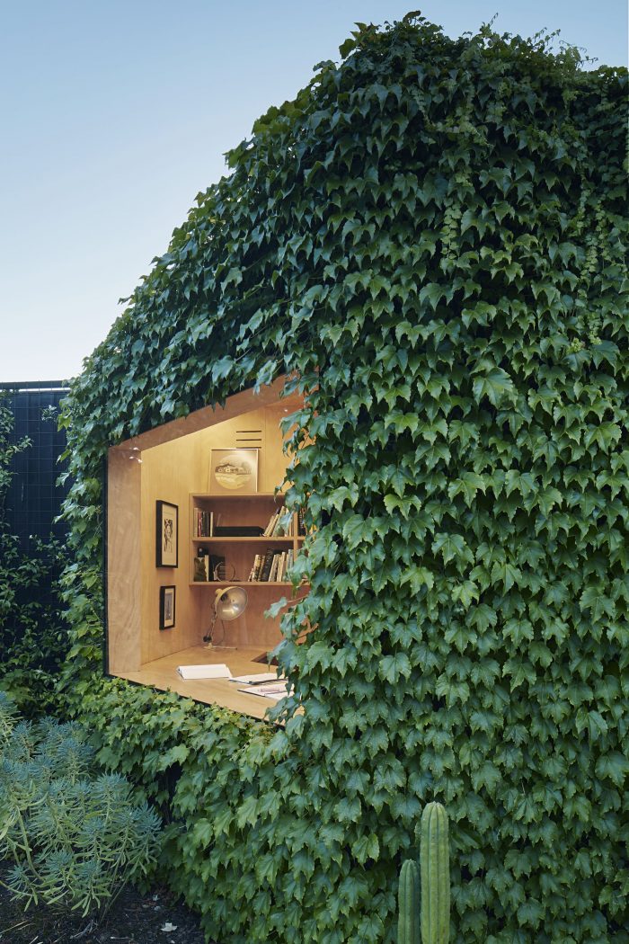 Camouflaged and nestled into a modest residential garden, the Writers Shed provides an isolated workspace for a creative writer. The outbuilding sits in the seldom utilised back corner of the block, located in a quiet, leafy residential suburb in Melbourne's South East. Masquerading itself amongst the garden landscape and boundary fences the shed is one with the landscape – a living part of the garden rather than an imposition on it. The successful coverage of Boston Ivy, accompanied by a collection of lush, verdant plantings was developed in collaboration with Landscape Garden Designer Ben Scott. Stepping inside, a generous and simple ply clad workspace reveals itself, with a framed window looking back to the garden. A mirrored doorway opens out to the rear bluestone laneway providing an option for deliveries and access. Sitting inside at the desk there's a certain inherent delight in bunkering down to look out to the garden and house beyond.