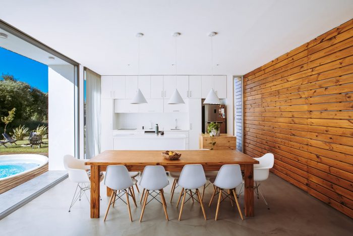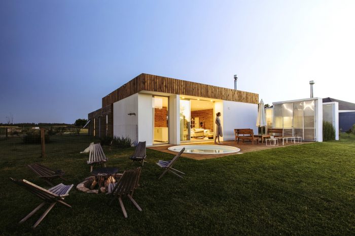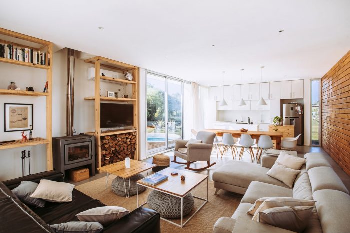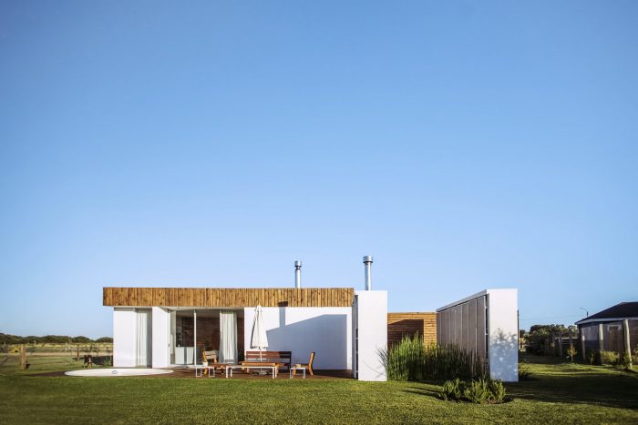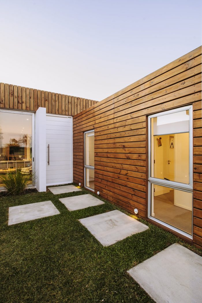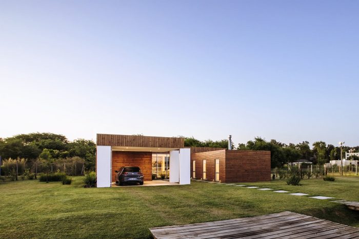 Located on the outskirts of Montevideo Uruguay, this house designed by “Bercetche Estudio” shows great respect for the environment and, through a nice space distribution, takes advantage of it. Two opaque volumes separated from each other generates a permeable “in-between” that gives rise to all the common activities of the house (Hall, living-room, dining-room, and kitchen) and connect it with the different boundaries of the land where it was built: to the front the main street of medium traffic, to the right a children's package, to the left a single-family house and to the bottom a glen with a leafy vegetation.