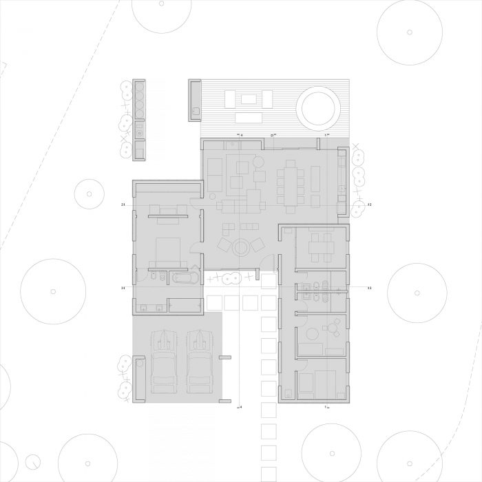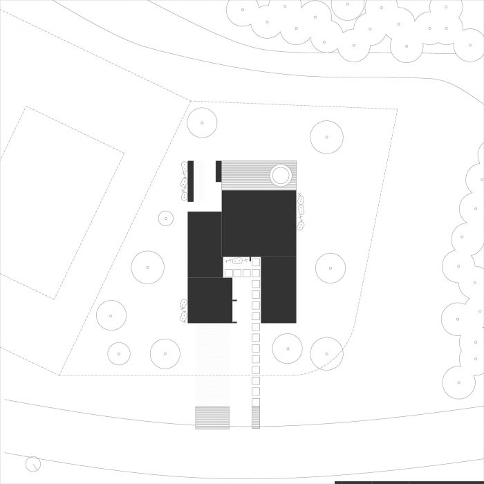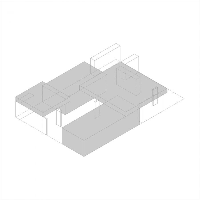 对于这些不同的情况,房子用一组特殊的体积来回应,产生不同程度的隐私。这些体量还包括车库、洗衣房和机械室。只有卧室有标准的窗户,在外墙上有均匀的分布,并在内部相互对齐,允许一个视觉交流,贯穿整个房子。