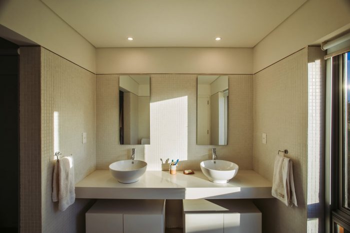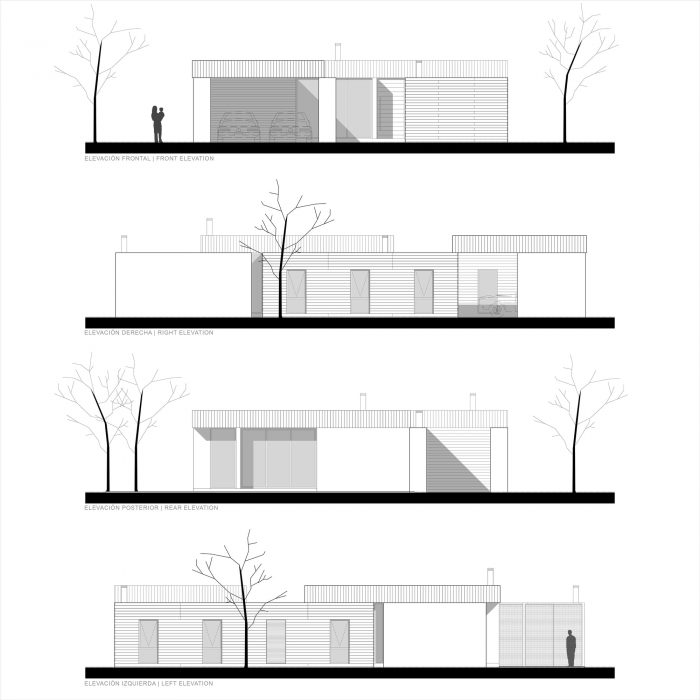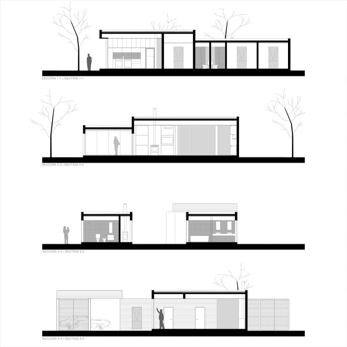 For these different situations, the house responds with a particular set of volumes that generates different degrees of privacy. These volumes also contains the garage, laundry, and mechanical room. Only the bedrooms have standard windows, with a homogeneous distribution on the facades and aligned with each other at the interior, allows a visual communication that crosses all the house.