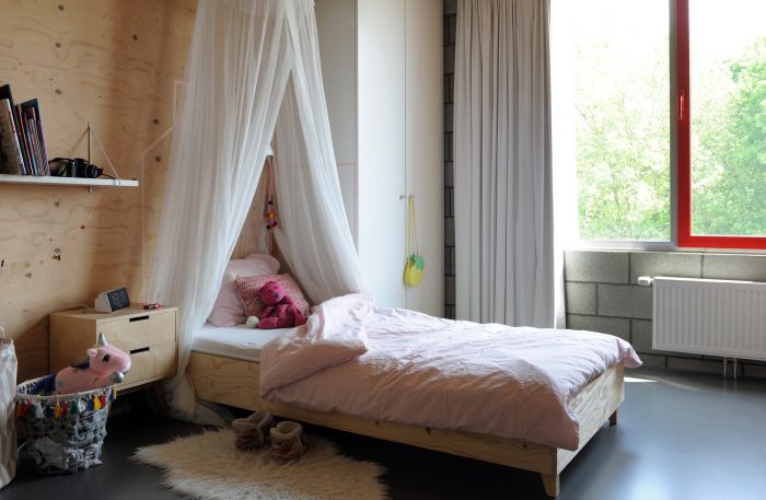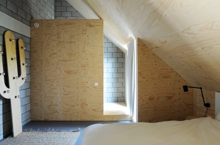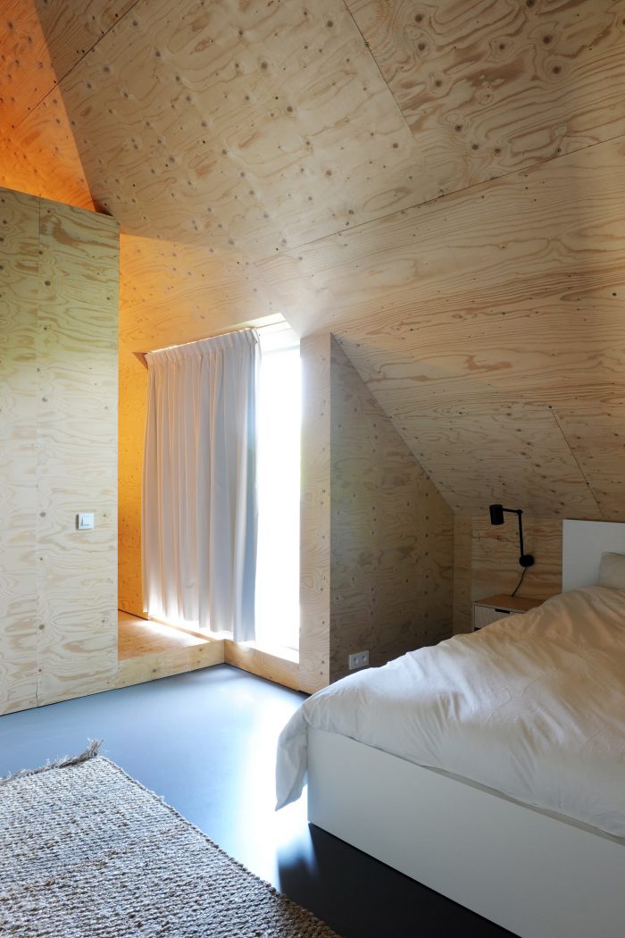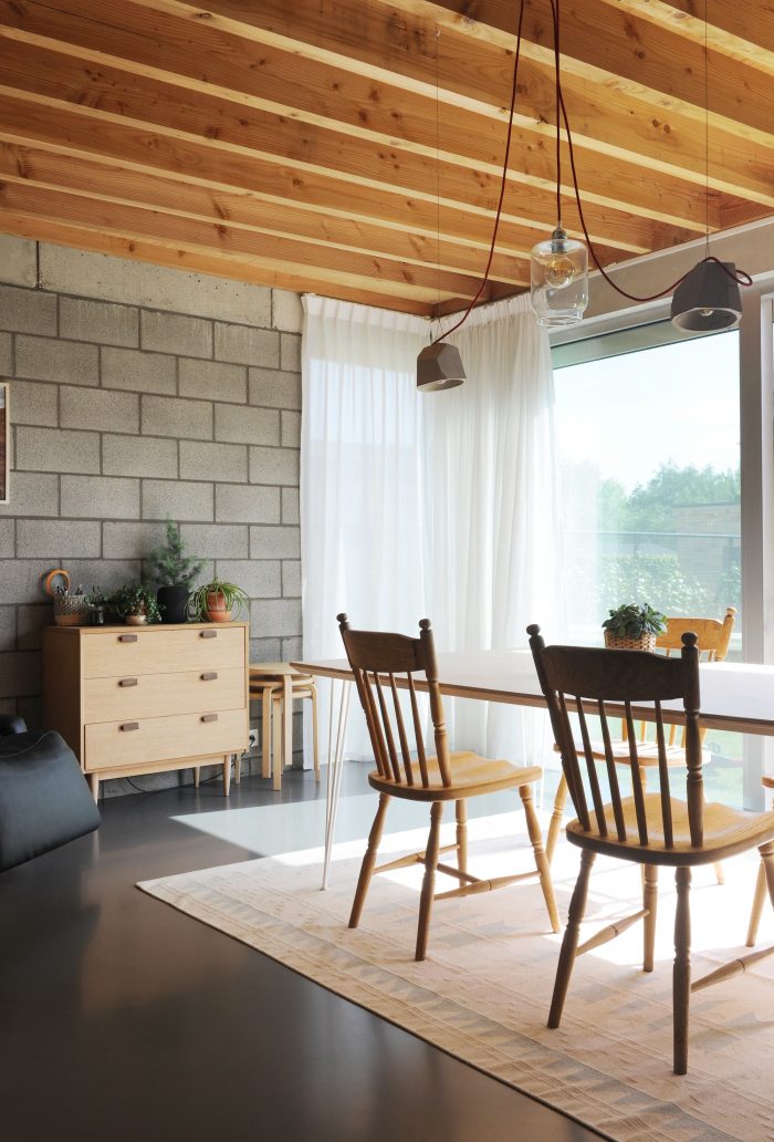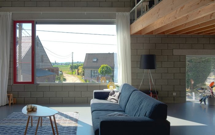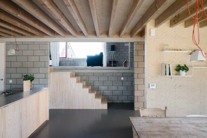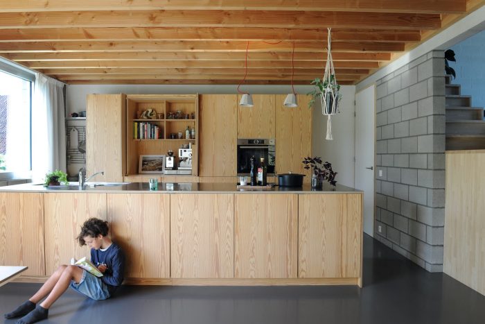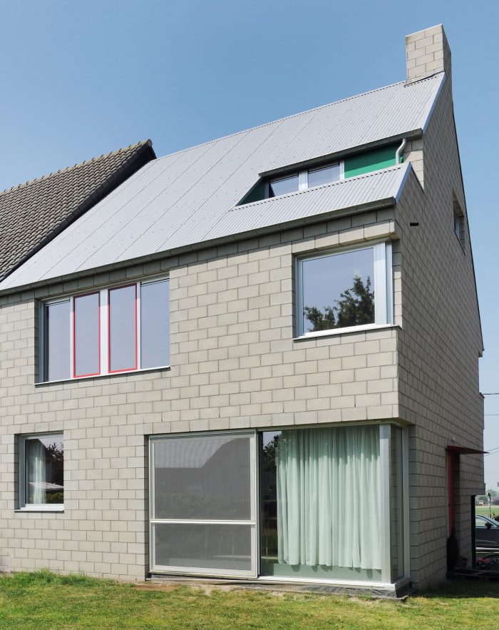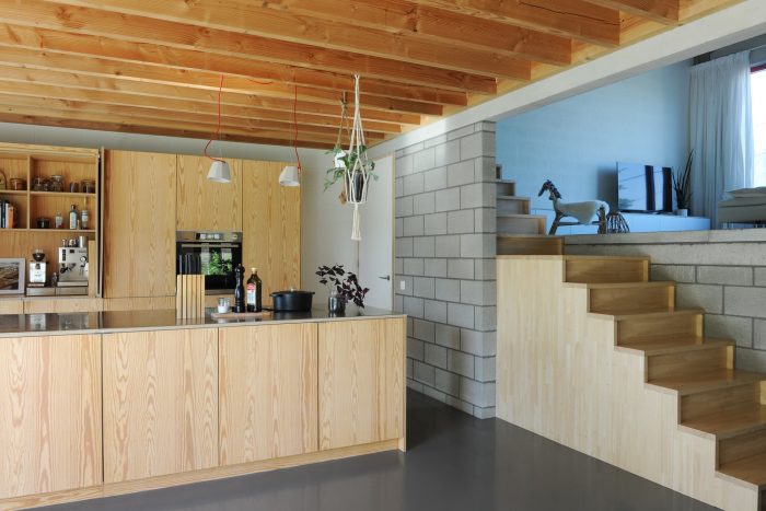 The windows, in contrast, are in polished aluminum with color accents referring to the color scheme of nearby old farmhouses. In the interior, these materials are complemented with various elements in wood: the staggered wooden beam floors connected by a straight rubberwood staircase in the middle of the house, kitchen furniture, and some light walls in pinewood panels.