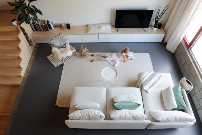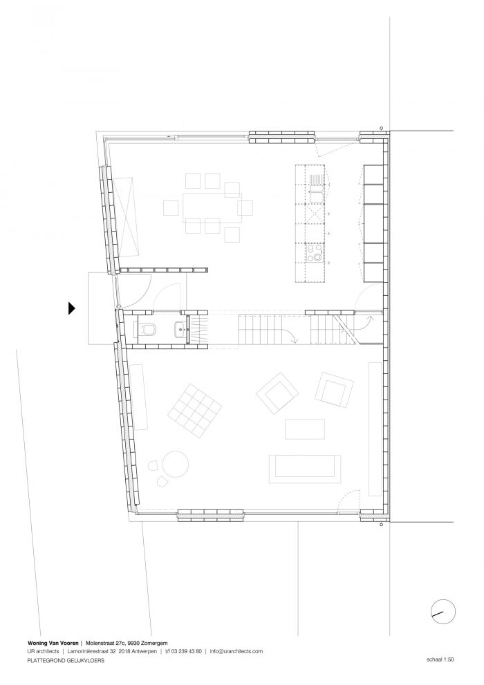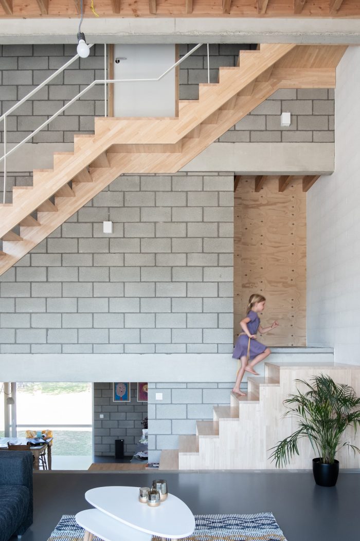 这种捉迷藏的主题在室内继续,交替的地板和具有不同开口的楼梯墙在空间之间创造了令人惊讶的关系。因此,生活空间顺利地流向彼此,在傍晚时分,引导阳光从街道穿过房子到花园边的用餐区。双层高的起居室,是对风车的遥远提醒,成为房子的自然震中。