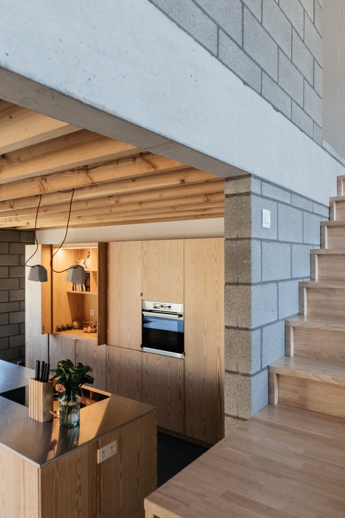 相比之下,窗户是抛光的铝,其颜色是参考附近老式农舍的颜色方案。在室内,这些材料与各种木质元素相辅相成:交错的木梁地板由房子中间的直橡胶木楼梯连接,厨房家具,以及一些松木板的轻质墙面。