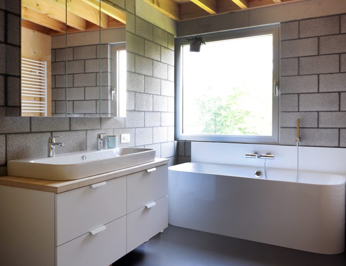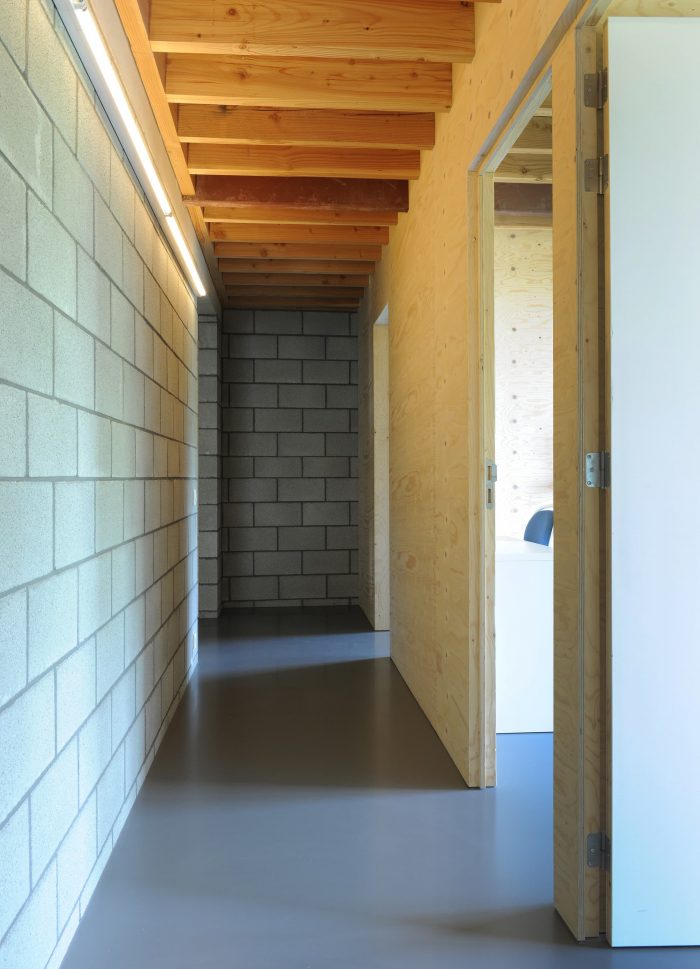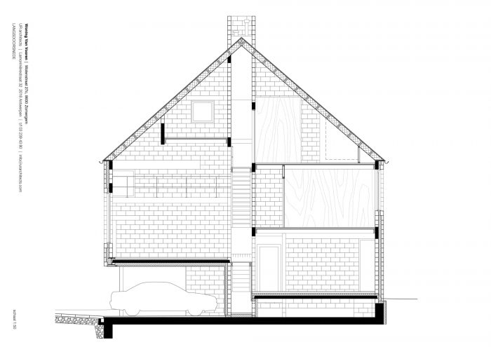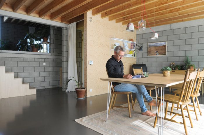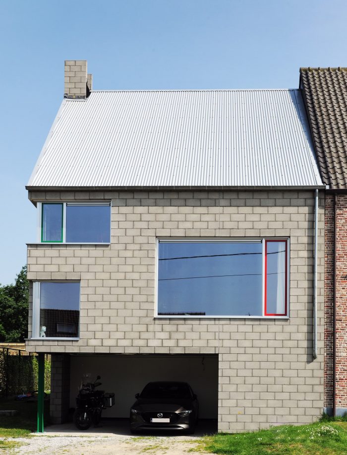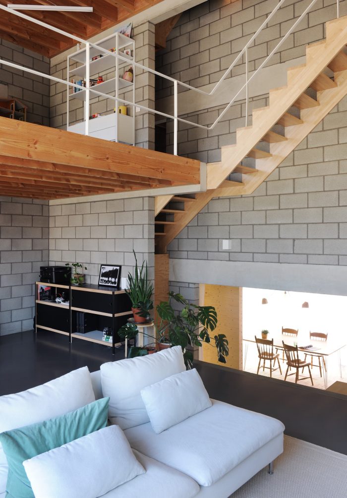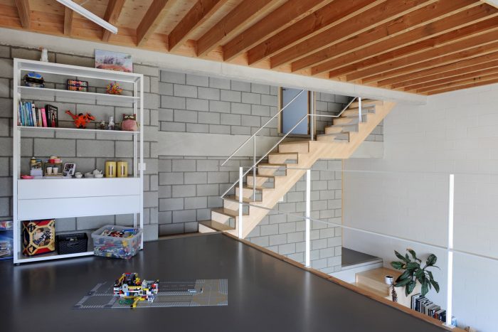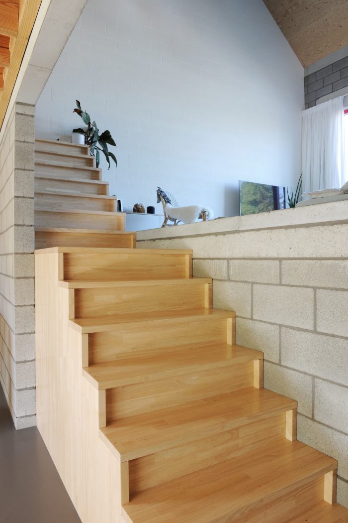 The gentle slope allowed me to deviate from the standard two-story plus roof with a garage in the back, and to imagine a compact split-level house with an integrated carport. The compactness of the outer volume contrasts with the internal spaciousness. The walls, both outside and inside, are uniformly built in exposed concrete masonry, forming a solid shell.