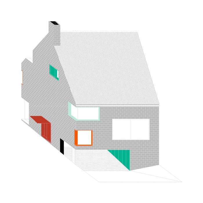 This theme of hide and seek continues in the interior, where the alternating floors and staircase walls with varying openings create surprising relationships between spaces. As a result, the living spaces smoothly flow into one another, and in the evening guide the sunlight from the street through the house to the garden-side dining area. The double-height living room, a distant reminder of a windmill's hold, becomes the house's natural epicenter.