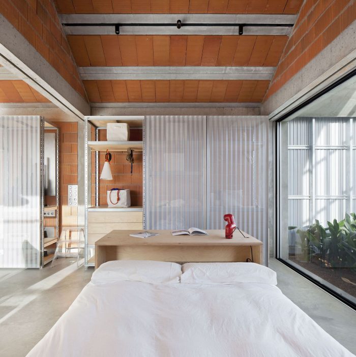 Las estancias que requieren un mayor nivel de privacidad como son el dormitorio y el baño se sitúan en los testeros, vinculándose al exterior a través de un pequeño rincón verde situado entre la edificación y el cierre de la parcela, lo que contribuye a desahogar estas estancias manteniendo una cierta intimidad. Formalmente, se adopta el tono humilde, sencillo y honesto de la edificación existente, expresándose mediante códigos más propios de un almacén o nave industrial que de una vivienda.