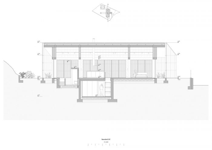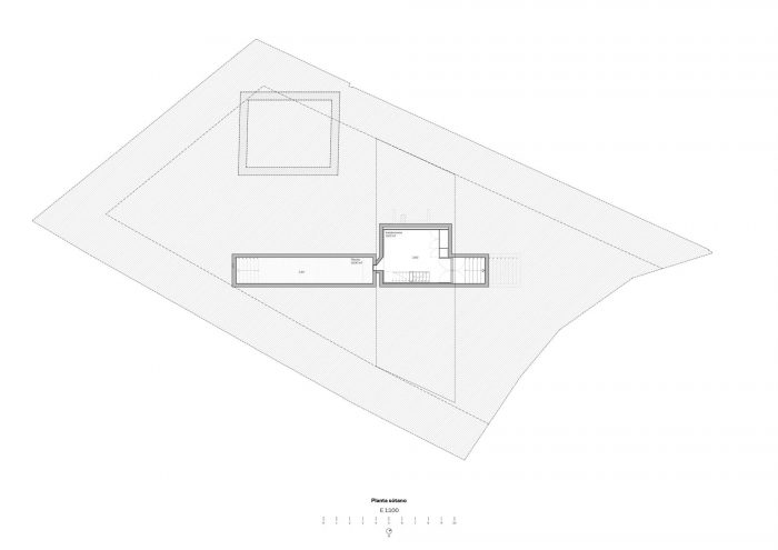 La edificación existente se rehabilita manteniendo un uso auxiliar como almacén y sala multiuso. Las edificaciones. El volumen de nueva planta cuenta con dos espacios bajo rasante, uno para ubicar las instalaciones de servicio del conjunto y otro relleno de agua para el baño (piscina), generando un recorrido de entrada y salida desde el exterior y el interior como eje transversal bajo el volumen principal.