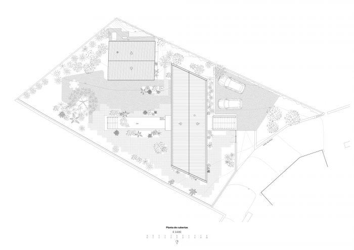 Situation. The geometry of the plot is like a rhomboid with 40 meters on the longest side and 22 meters on the short side. The longest side is oriented in the northwest-southwest direction. The short side is in contact with the road which communicates the house with the village of Xinzo. The topography is assimilable to a flat surface with a minimum fall in a longitudinal direction. However, there is a vertical drop in relation to the neighbor’s plot, in the north. There is an auxiliary building in the northwest plot’s corner intended for storage.