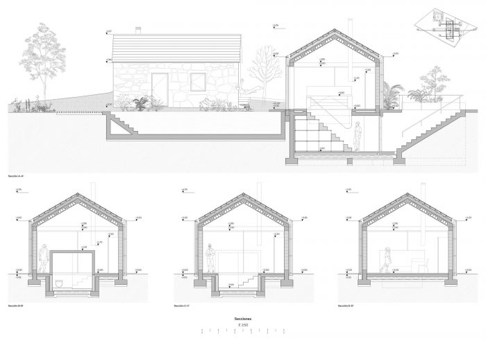 Schedule. It is requested by the owners of a construction that, having a housing use, could be flexible enough to different use configurations and forms. For that reason, it was projected a unique space which is divided into different areas (live, cook, bath, rest) along it. The existing building is refurbished, keeping its auxiliary use like storage and multiuse room. Buildings. The new building volume has two spaces below ground level, one to locate facilities building and other for a swimming pool, generating a transversal axis under it which create an entry tour from the exterior and vice versa. The form has its origin on an existing building section, a common building section of the galician popular one-storey architecture and with symmetric gable roof. Based on this figure as an element of integration into the landscape, the project starts to grow, in response to a particular functional schedule, seeking its own character from an expressive point of view.