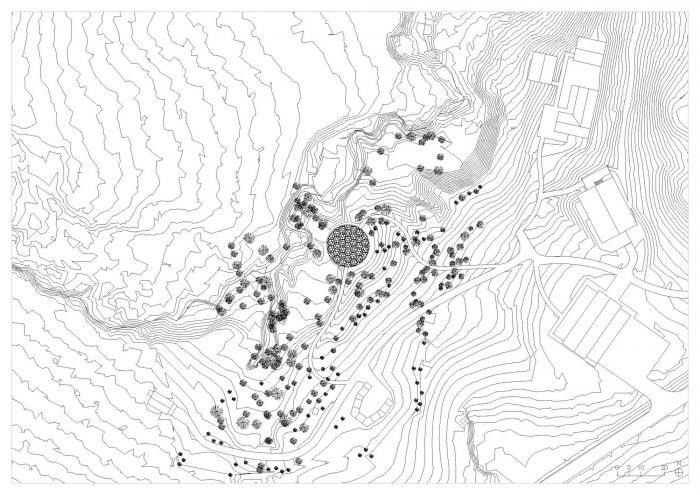 In the pavilion, sunbeams penetrate between the vertical logs, creating a play of light and shadow that softly hits the underlying organically shaped seating, equally carved in wood. and the polished concrete circular platform. The spatial complexity of the seating elements emphasizes the stunning views of the surrounding landscape through strategic positions and encourages different appropria- tions by the visitor, who is invited to inhabit them at his wish. Through exploration, the user can, in fact, discover the different spatial configurations of the pavilion, gather in small groups or have a chat between friends, lie and watch the romantic views with his partner, or sit and meditate in solitude on his visit of the Art Center.