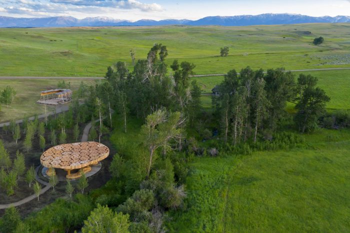 Located in a slightly sunken landform between the main facilities of the Art Center and the beginning of the hiking tracks, the pavilion rises in a clearing surrounded by aspen trees, facing a small creek. Entirely carved in wooden logs, the pavilion symbolically invites the visitor, who in the Tippet Rise Art Center is confronted with nature at its widest scale, to access the most secret part of nature, the heart of the trees. The sustainable pine wood used for the entire pavilion, locally sourced from a natural pruning process that saves forests from parasitic bugs, is employed in its raw appearance.