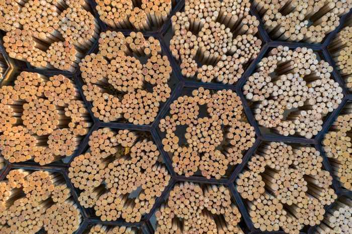 The logs of the canopy are assembled in circular bundles bore by a modular hexagonal structure in weathering steel, lying on top of seven steel columns. The upper surface of the canopy is carved sinuously in order to create a rounded topography that blends in the surrounding hills. At the same time massive and light, the roof is inspired by the “toguna”, the traditional most sacred space in every Dogon village, a wooden and straw shelter designed in order to protect from the sun but at the same time to allow the ventilation of the shaded space underneath.