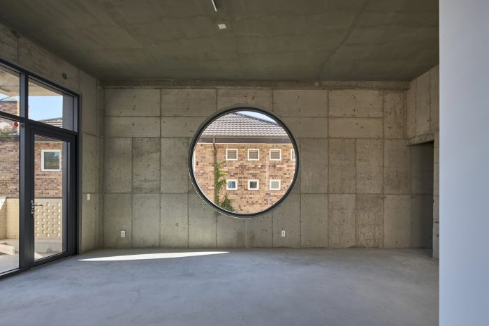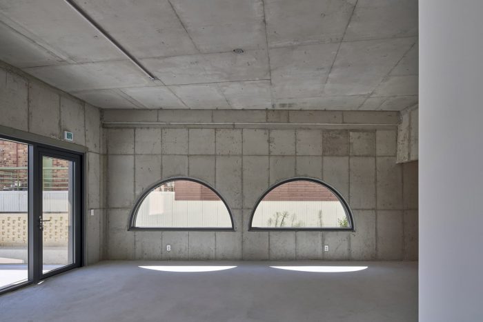 Windows that create a colorful expression - The window design of the Y2 building gives the building a three-dimensional sense and expression. The front part, which has a panoramic view of the Yeonhui-dong residential area, is opened fully with floor-to-ceiling windows. The side windows that are close to the neighbors because it faces a narrow alley have a variety of window shapes to relieve the stuffiness. Two half-moon windows on the first floor and a circular window on the second floor gave a change to the space and made the building look interesting even from the side alley.