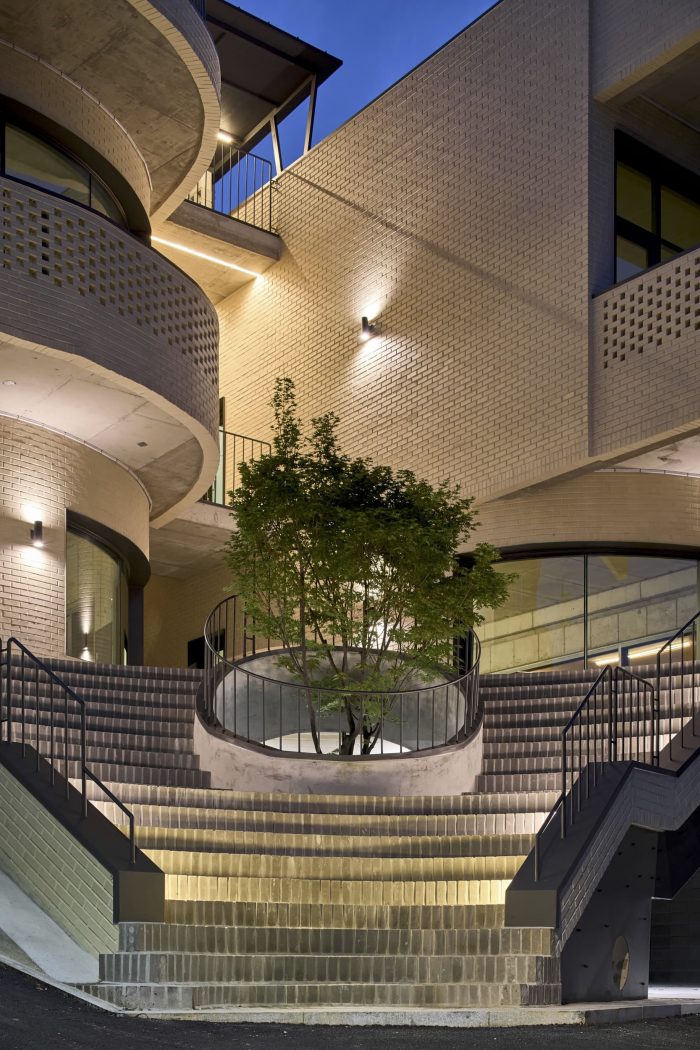 吸引人的开放性建筑--Y2大楼有地下一层和地上两层,它的设计元素强调了建筑正面的开放性。 一楼的楼梯和前院,二楼的露台,以及屋顶的户外空间被放置在建筑前面,使其具有生动的气氛。 在地下一层,也就是入口处,放置了一个院子,以吸引光线进入深层空间。 鲜艳的砖块给建筑带来了明亮的外观,增加了人们的认识和注意力。米色的砖块创造了一个明亮而温暖的空间,从角落里的道路直接通向外面的楼梯进一步强调了其开放性。 主楼梯通向小巷,自然地引导人流进入建筑。I