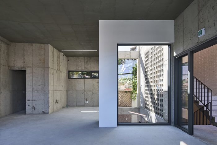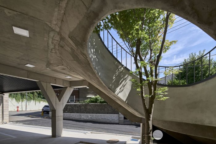 n the center of the stairs, inspired by the pavilion tree at the entrance of a rural village, a native maple tree was planted to give the accent color. The path that breathes - The basement floor can be entered easily from the front road due to the level difference of the sloping site. The good size of the courtyard at the back of the building gives enough light to the basement and serves as natural ventilation. The external staircase planned in the center of the building not only secures the minimum-length passage, but also exposes light, ventilation, and lively people to the outside, making it possible to create various expressions of the entire building.