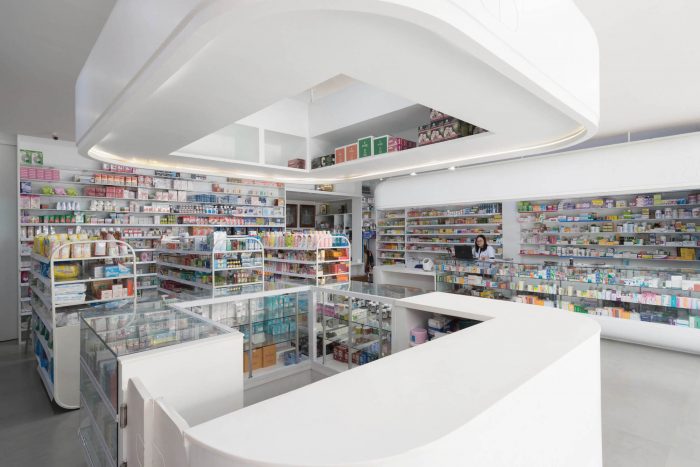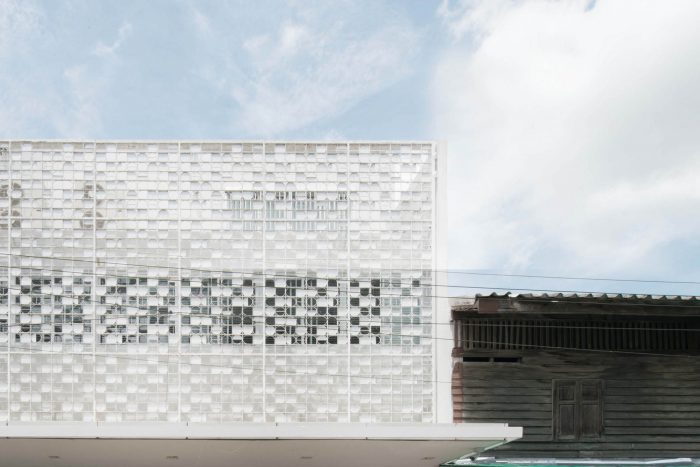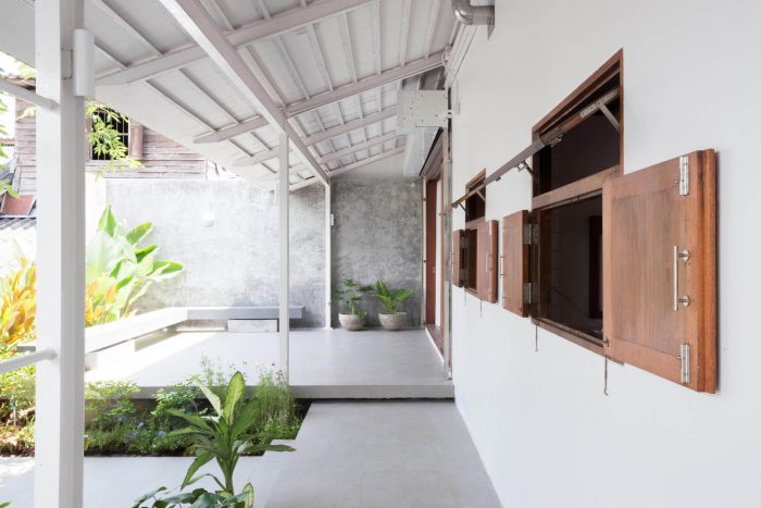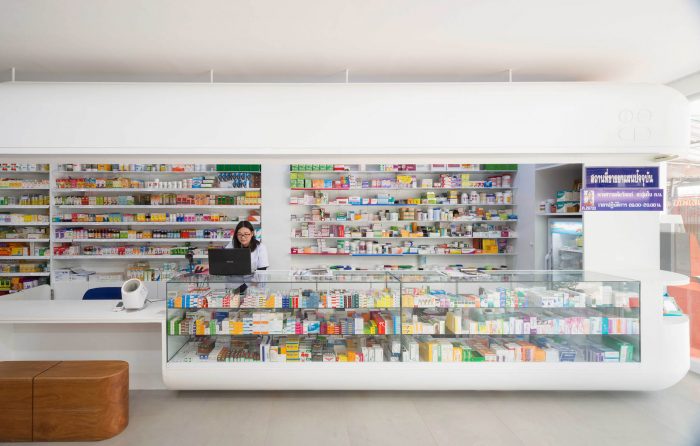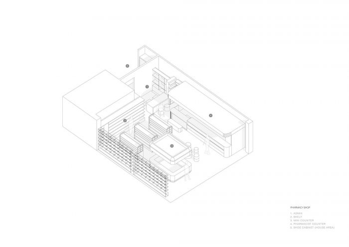 From outsideview, the building has 2 different façades for residence and drugstore. The residence façade isseen as a white wall with various sizes of wooden windows according to the rooms function while the drug store façade material is wrought iron which is known for protection of sunlight and burglar in the local. The pattern design is simplified from the pill capsule to make people easy to notice it is the pharmacy.