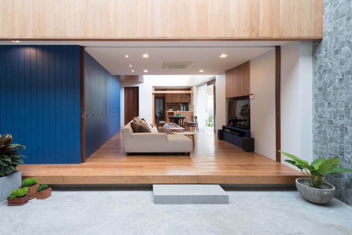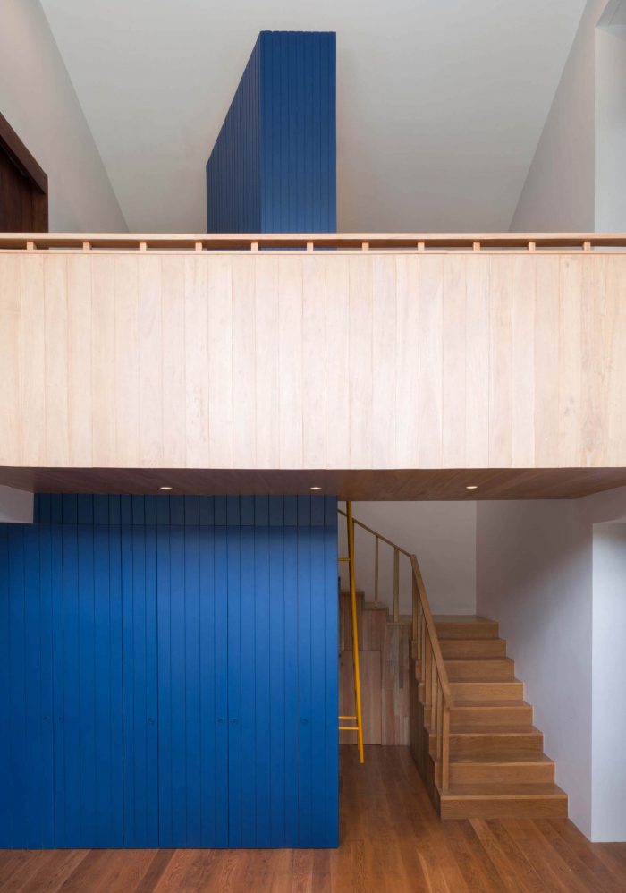 For material use, since the owner has the old wood from the demolished house and the new wood they have been planted for 15 years, The demolished house's hardwood is used in the structural part, mainly for roof structure and the remaining old wood was sanded and painted in blue color to cover imperfect texture and used as interior featured. The new self-grown wood is used as the main material in house interior. This material use creates value and story to the new house and blending sense of old and new place.