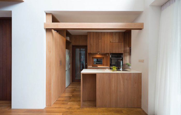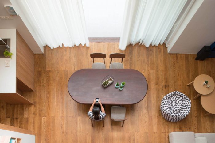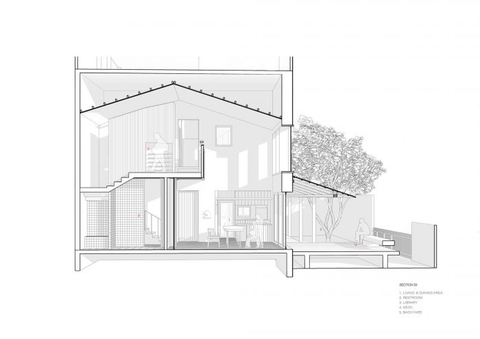 由于其规模较大,设计的目的是将商业建筑空间重新设计成家庭式的规模,创造一个隐藏在场地后面的小房子,使家庭生活更加舒适,并创造一个公共空间,按照家庭的要求连接房子的每个区域。通过简单的设计方法,住宅区从3层的店面变成了2层的独立屋,例如,庭院阳台;掩盖了第三层的药房仓库,以及公共区域的双重空间,这在该社区的此类建筑中是很少见的。