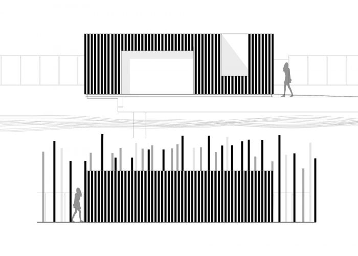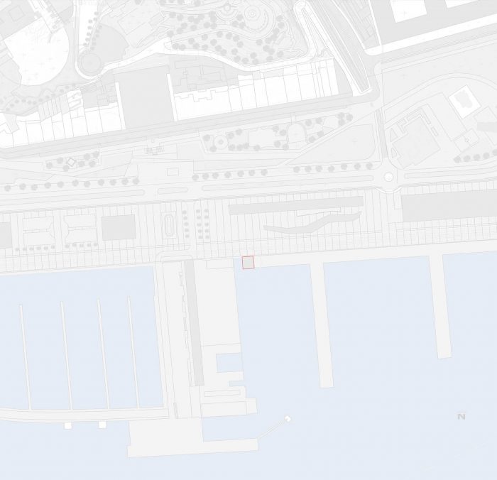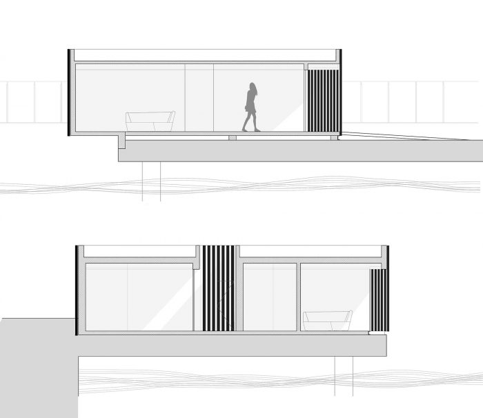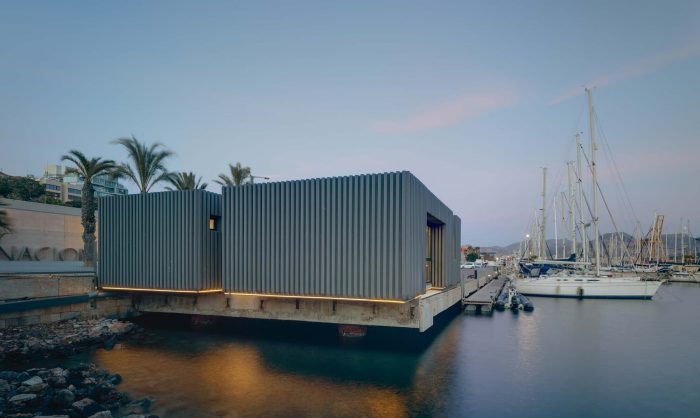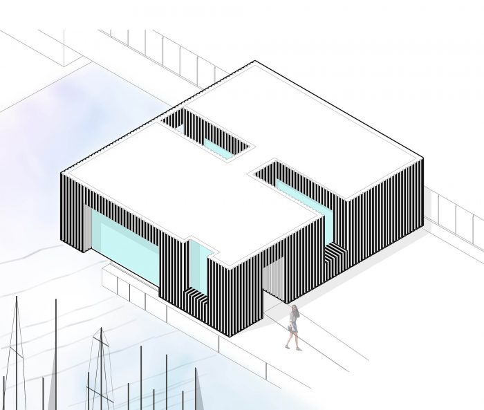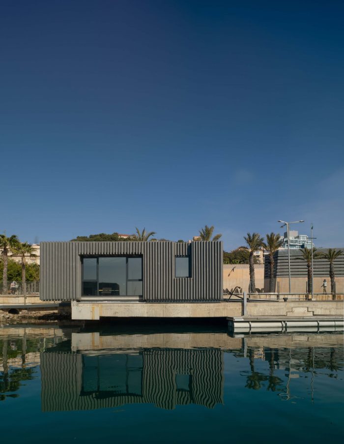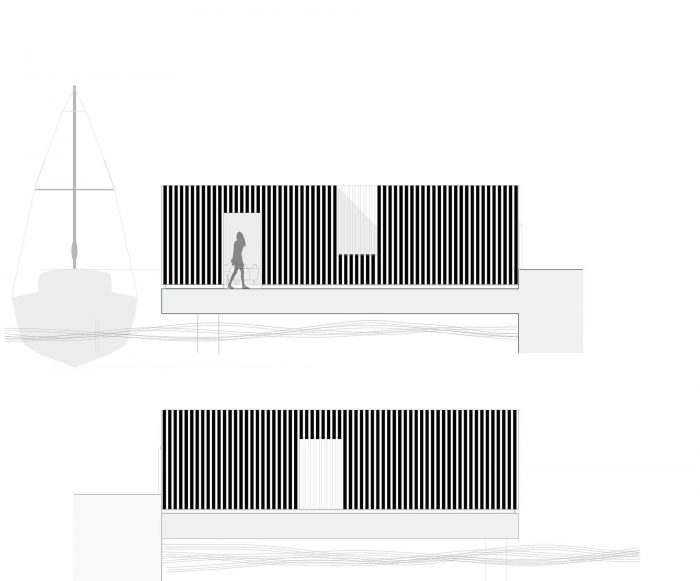 The dressing room building, in the vastness of its context, surrounded by large and solemn buildings by the sea, is perceived in the beauty of its smallness, like a boat surrounded by large ships in the ocean. Its shape from the surface reveals the service provided. The building hides its sailors inside, preserving the intimacy of its mission, only the sea, like a faithful friend, can see them.
