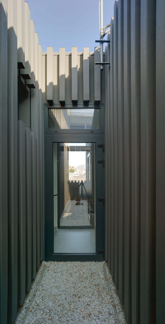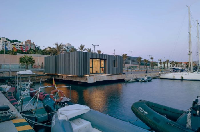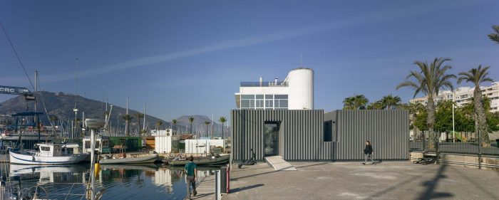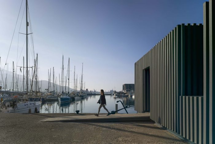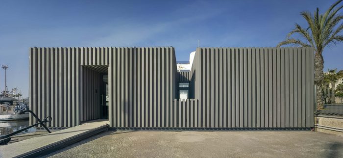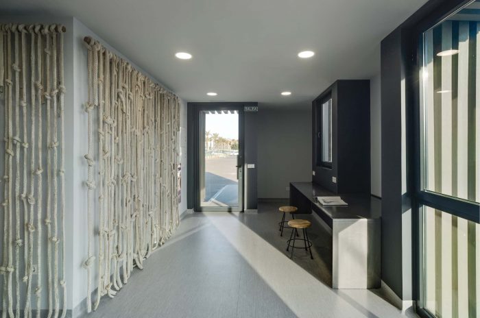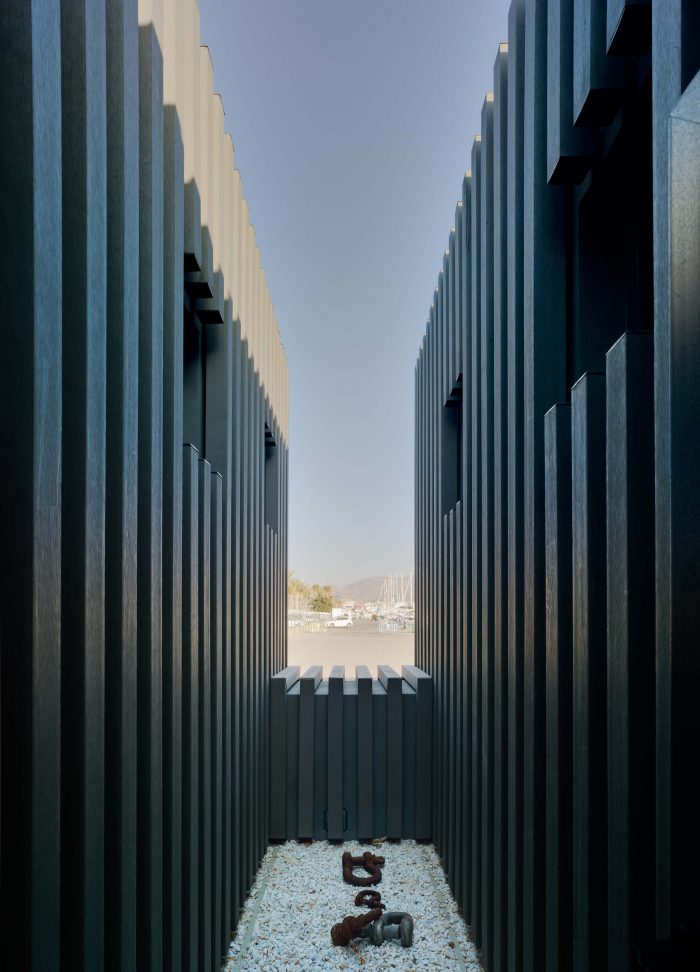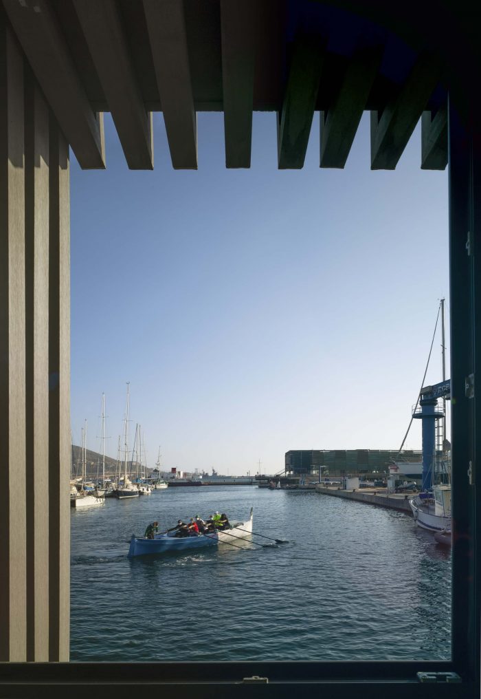 The light sculpts the volume through two large grooves that pierce it from within, generating two interior courtyards that provide lighting and ventilation to the users who remain safe inside. The skin is moving shade. Built of natural resin slats, it changes depending on the light, creating the dynamism sought on land, reproducing the waving of the rigging in the wind.