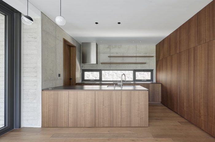 三明治保温、裸露的混凝土和碎石混凝土--业主喜欢混凝土的坚硬、牢固;因此,在建造墙壁时采用了三明治保温裸露混凝土的方法,以确保从房屋的内部和外部都能看到混凝土的暴露。房子被设计成具有不同质地的裸露混凝土,以适应每个区域的特点。首先,紧挨着道路的底层建筑像一个立体板,支撑着整个建筑。这个底层有类似石头的质地,给人一种坚实的印象,这也是业主所希望的。