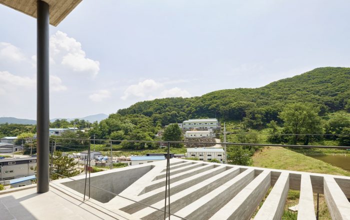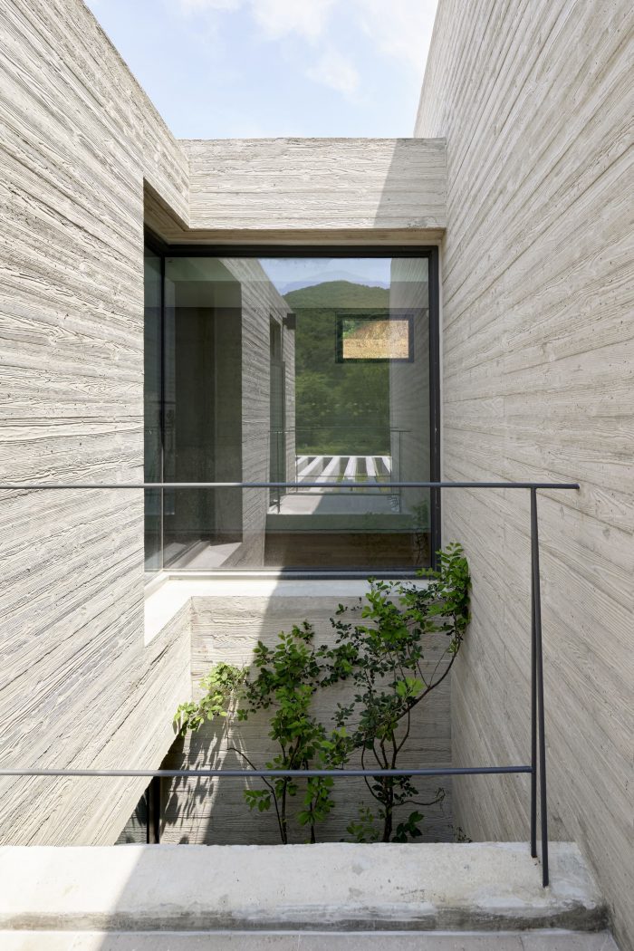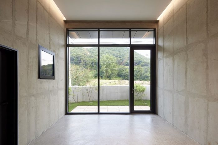 The exterior concrete walls of the ground floor were chipped to give a rough texture to the walls. The chipped concrete wall texture was done by hand. An EPS mold (depth 35mm, width 20mm) was built to cure the concrete, which was then chipped and textured manually. The exterior of the first and second floors was made with board-formed concrete in order to give a wood grain texture while simultaneously maintaining the use of concrete. Raw concrete was used for the inside walls to maintain the concrete aesthetic throughout the whole building. However, this concrete was highly in order to make the concrete’s surface smooth to the touch. The Yangsan Panorama house was designed with a variety of concrete textures in order to maintain a hard aesthetic without making it too uniform.