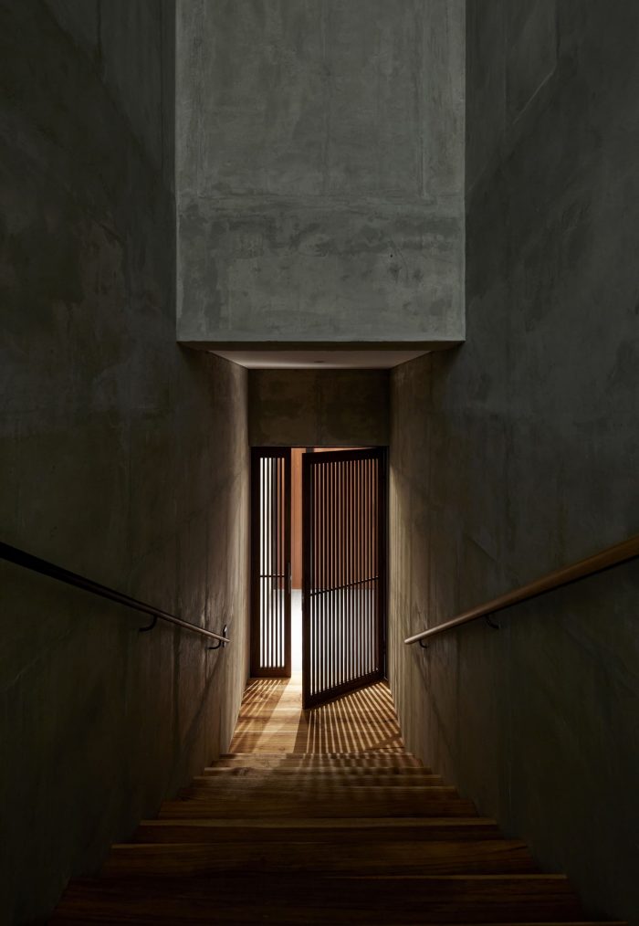 Sandwich Insulation, Exposed Concrete, and Chipped Concrete - The owner prefers the hard, solid nature of concrete; therefore, the sandwich insulation exposed concrete method was used when constructing the walls to ensure that concrete exposure was visible from both the interior and exterior of the house. The house was designed to have exposed concrete with different textures to fit the characteristics of each area. First, the ground floor next to the road is constructed like a stereobate and supports the whole building. This ground floor has a stone-like texture that gives the house a solid impression, which the owner desired.