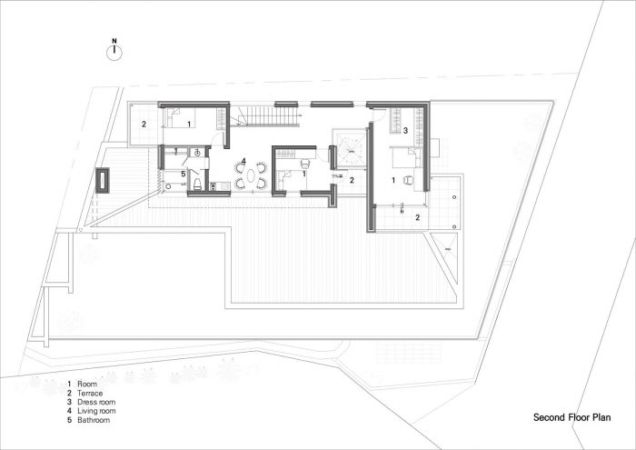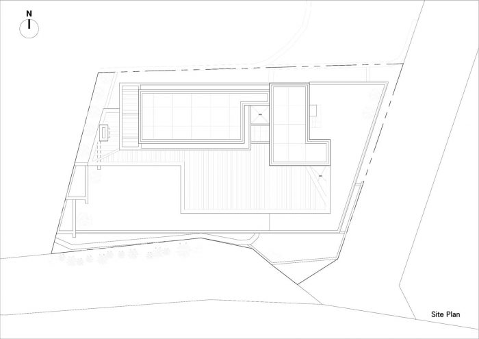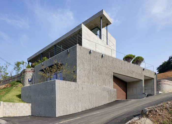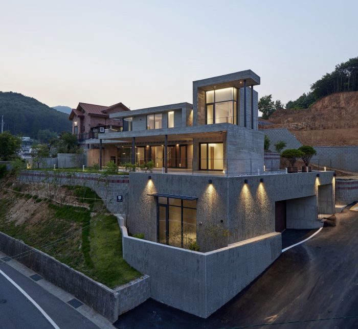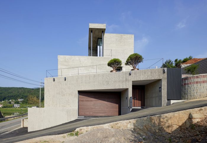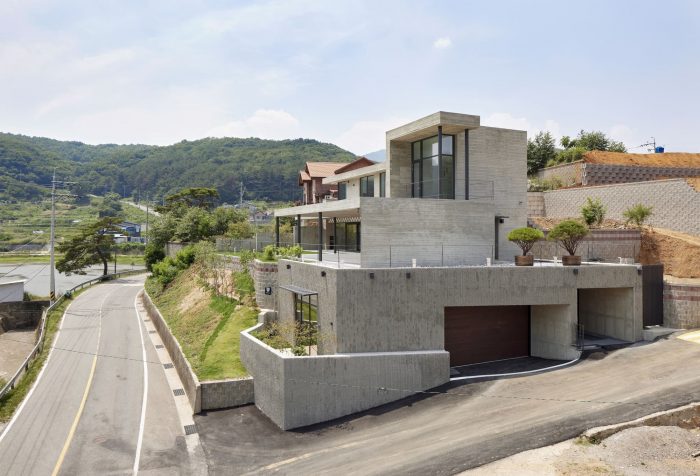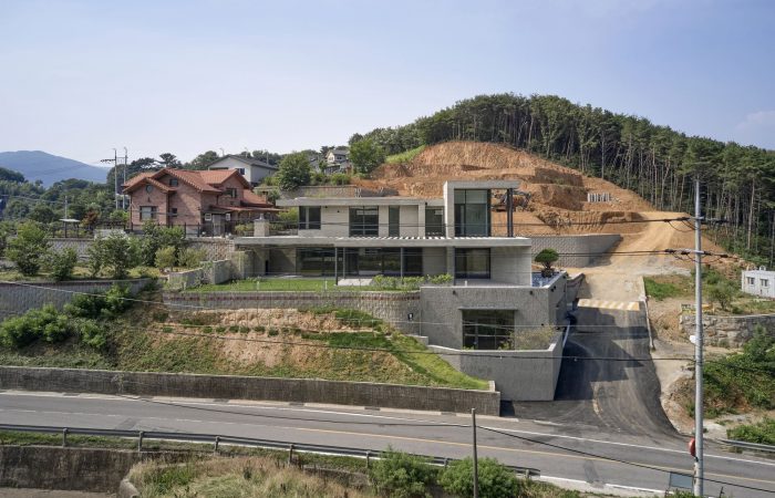 The Yangsan Panorama House is built upon a plot of country land that was originally covered with woods. The plot was cleared and leveled using reinforced soil blocks. Prior to this, the land had a 4-meter dip in elevation, which is now at an even height. The Yangsan Panorama House overlooks the Dangchon reservoir and has a stunning view of the mountains, which cannot be seen from the road. According to the owner’s wishes, the interior and exterior of the house were built with solid materials that make for a rather simplistic and minimalist design.