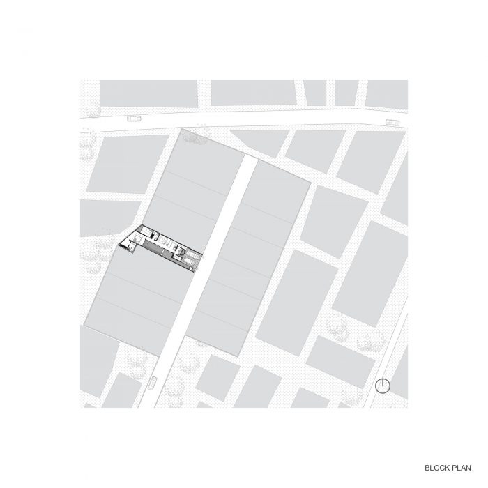 This one-floor house occupies a long, narrow site in a residential neighborhood in southern Jakarta. Though it is looking rather solid and unusual from the façade, the experience felt when entering the house is intended to be a very down-to-earth journey. The wooden lattice ceiling allows plenty of sunlight into the main entrance, and through it, there will be a foyer and an inner courtyard waiting. The foyer acts as a transitional space that softens and blurs the outside world with the living spaces within.
