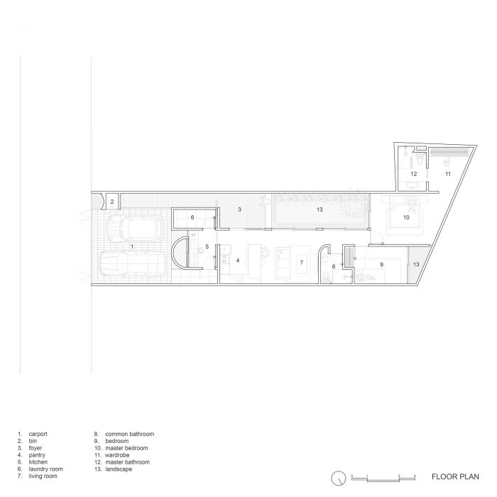 这座一楼的房子在雅加达南部的一个住宅区里占据了一个狭长的场地。虽然从立面看它相当坚固和不寻常,但进入房子时感受到的是一个非常朴实的旅程。木格子天花板允许大量的阳光进入主入口,通过它,会有一个门厅和一个内院在等待。门厅作为一个过渡空间,使外部世界与内部的生活空间变得柔和、模糊。