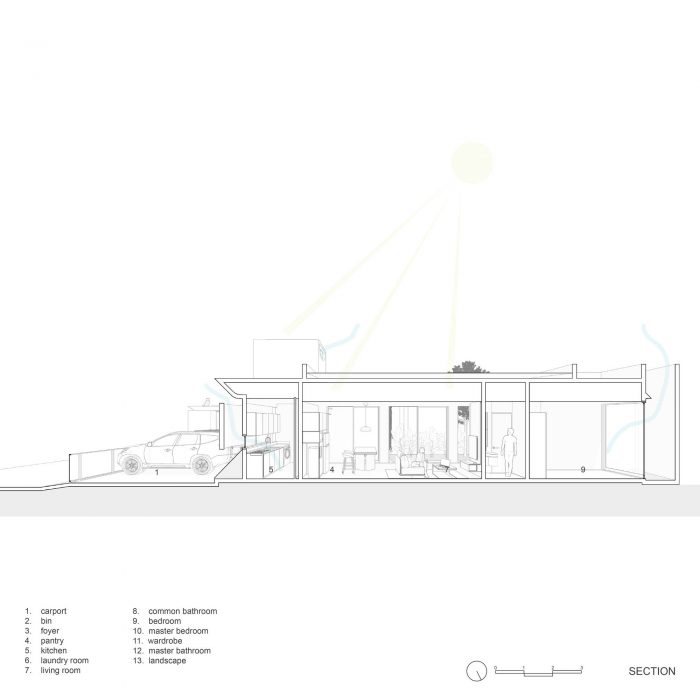 All rooms in this house are designed to have direct ventilation to maximize air circulation and natural light intake. The tall tower seen from the façade not only adds character to the house but is also crucial to perform the stack ventilation (chimney effect) to the laundry room. Behind the half-moon-shaped concrete façade, there’s also a service kitchen with large windows opening to allow the air to circulate and release the cooking smell. This solid part is blocking the view to the street, giving a sense of privacy to the cook. Air circulation and the human scale are the 2 key important aspects that shape this defined space.
