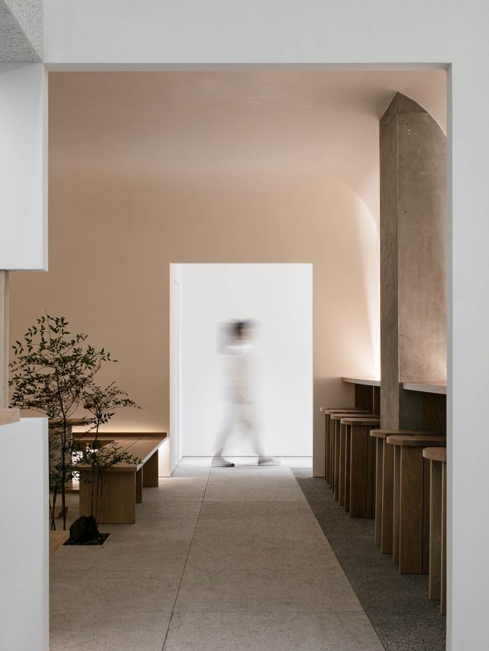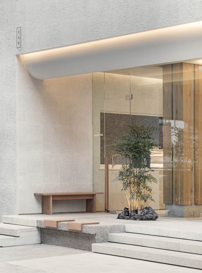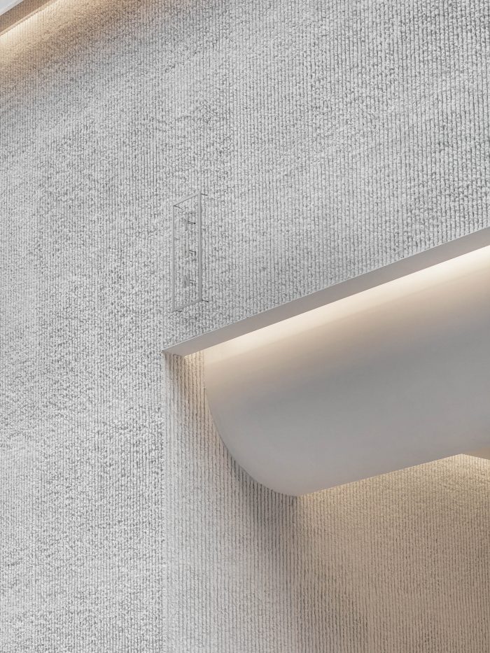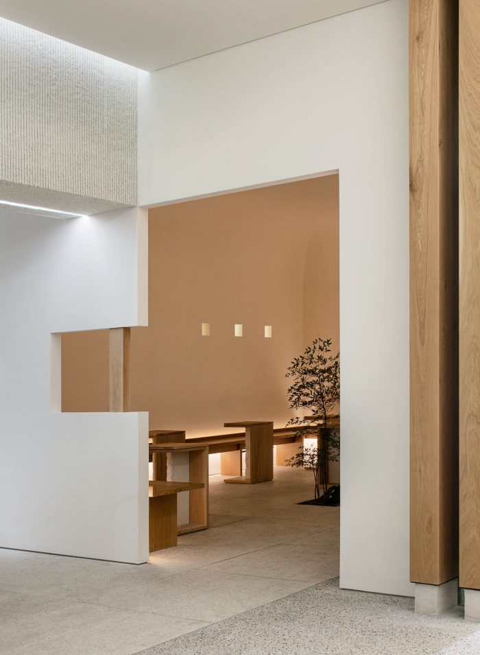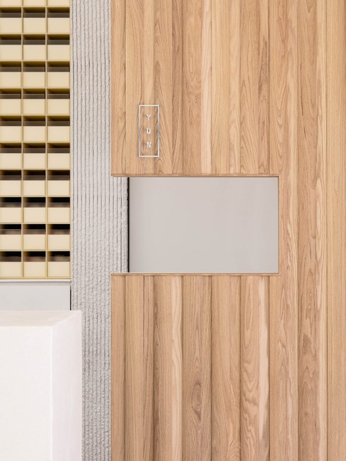 我们把 "Dansaekhwa "和 "白瓷 "的细微差别放在空间中,以表达YUN的纹理的极简主义。它让我们体验到不同事物在不同人眼中的互动和共存。当丹青的表达技巧的简单而重复的语言渗透到汉字中,并沉浸在无数的色彩中,白色的光渗透到混凝土的纹理中,在空间中反射光线。天花板的形式有凸有凹,让人可以感受到各种空间感受。