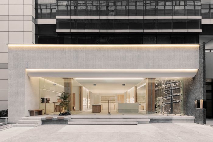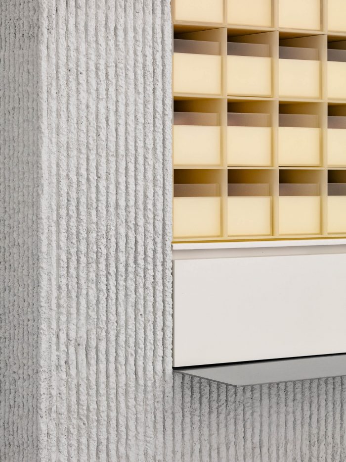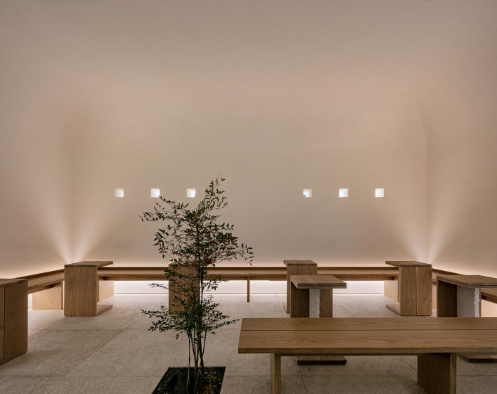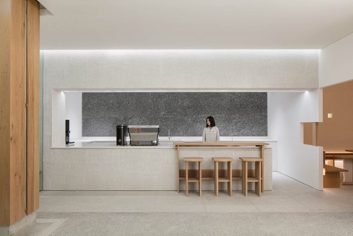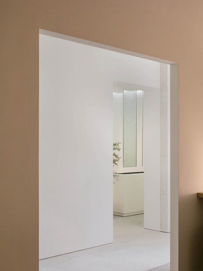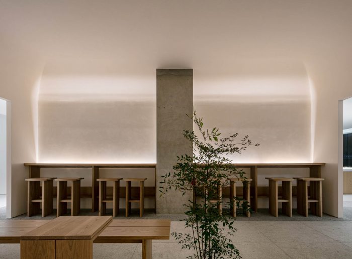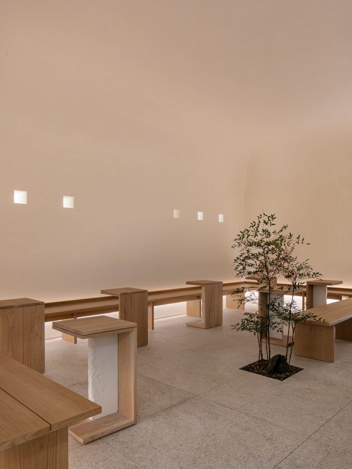 我们把 "Dansaekhwa "和 "白瓷 "的细微差别放在空间中,以表达YUN的纹理的极简主义。它让我们体验到不同事物在不同人眼中的互动和共存。当丹青的表达技巧的简单而重复的语言渗透到汉字中,并沉浸在无数的色彩中,白色的光渗透到混凝土的纹理中,在空间中反射光线。天花板的形式有凸有凹,让人可以感受到各种空间感受。