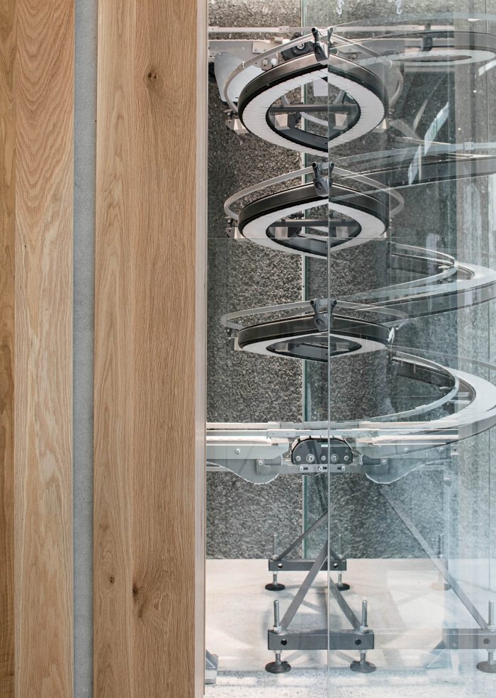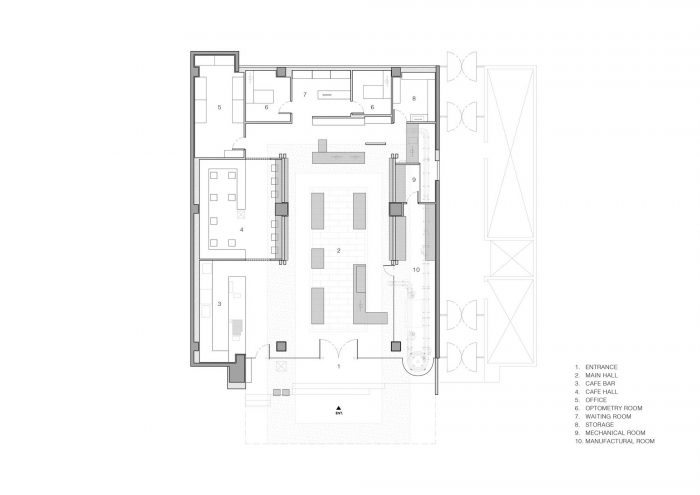 contact with the sky. The column is the axis of the flow in the space that supports the ceiling and serves to distinguish the large functions of the interior, such as cafes and showrooms.