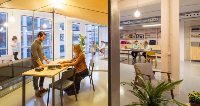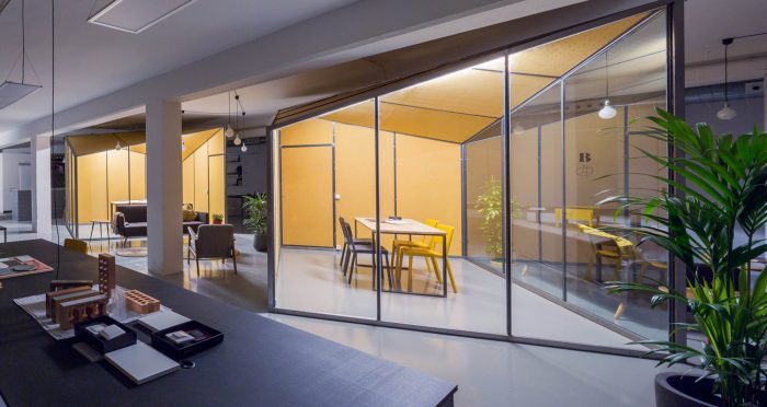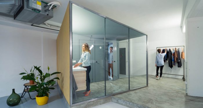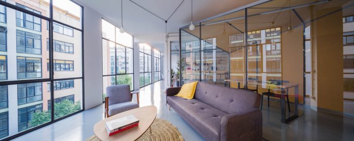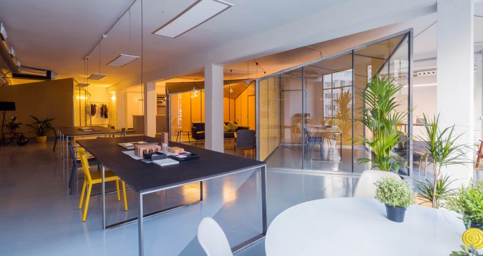 The working space has a configuration very commonly found on buildings built in the 70’s at the Poble Nou neighborhood; large lofts with completely glazed facades that housed workshops and warehouses, with various people and service lifts, and a very industrial character that’s reminiscent of the neighborhood’s productive past which is now undergoing a continuous renewal. We found a space that was empty and completely lacked partitions, 300 m2 supported by reinforced concrete pillars and hung beams.