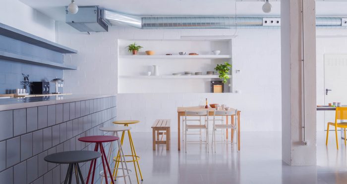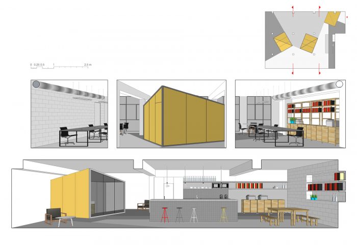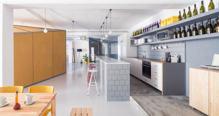 We then set ourselves to solve the volumes and the working tables with the same material. We used colored chipboard, which is durable, water resistant and available in large sizes. The rest of the rest of the furniture are standard modules adapted to the dimensions of the spaces.