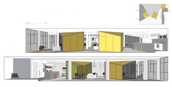 These volumes were originally thought of as rectangular boxes with flat roofs, the minimum structure for a meeting room. As time went by, we deformed these, transforming them into asymmetric pieces by elevating the diagonal to the roof, increasing its volume up to the capacity set by the limits defined by the slab and the hung beams.