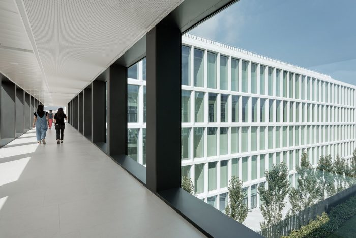 By finishing the façade and the roof in light colors, the building manages to capture less heat by limiting the increase in ambient temperature due to the heating of the buildings, also known as the “cool island” effect. The repetition of the window modules generates a sober and elegant exterior image of the building characterized by verticality. The commitment to the white color gives depth, contrast, and luminosity to the building.
