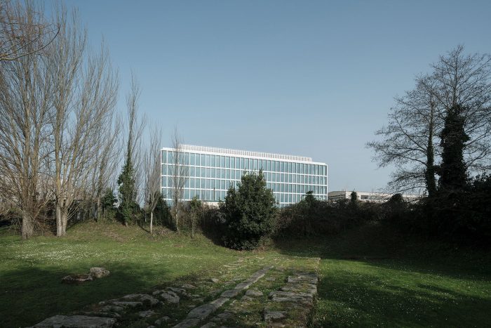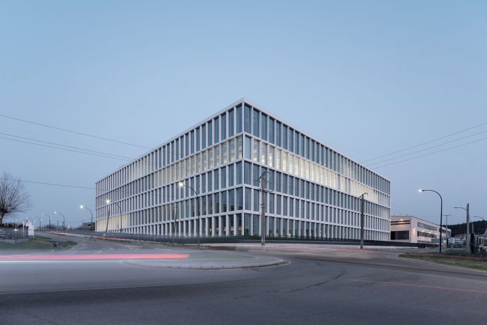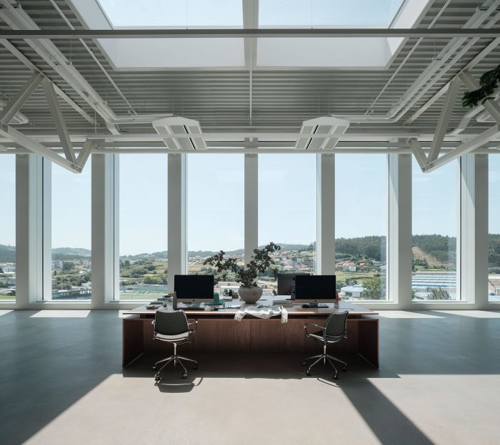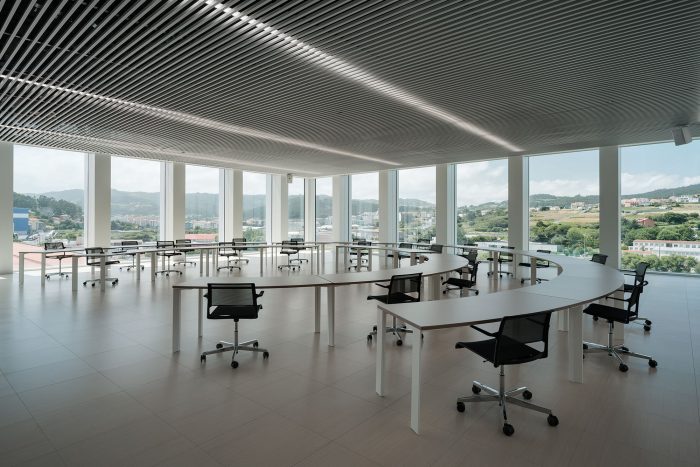 The façade system solves, by means of large 4.8-meter high high-efficiency glass modules, the interior lighting of the workspaces and incorporates the structural pillars in the space between modules, freeing the interior spaces from pillars close to the façade. and increasing the sensation of space and natural light. Incorporating the mass of the pillars into the outer skin improves the building’s thermal insulation and reduces its energy demand.