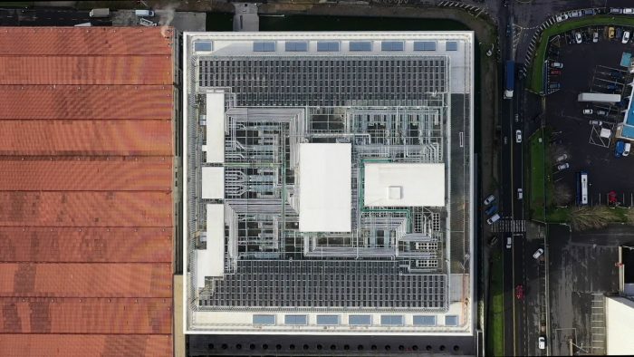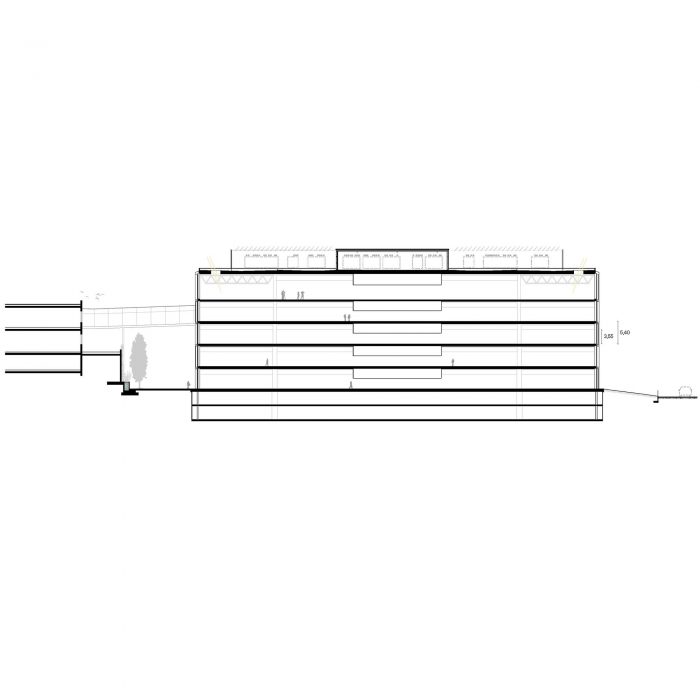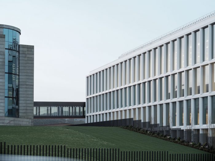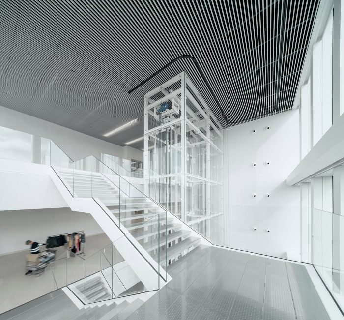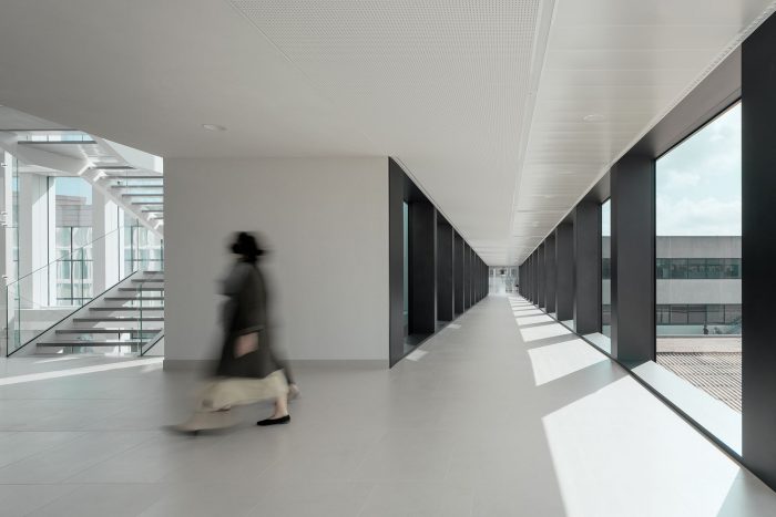 The connection with the new building is generated through a new walkway that completes a large internal connection axis and will allow access to the new building in an accessible and very intuitive way, following the logic of the previous phases. The new building consists of 5 floors of 90×90 m, which are organized into two large free-height work spaces complemented by support and service spaces located on one side and in the center of the plant. This configuration allows generating the necessary flexibility to adapt to different present and future needs of the company.