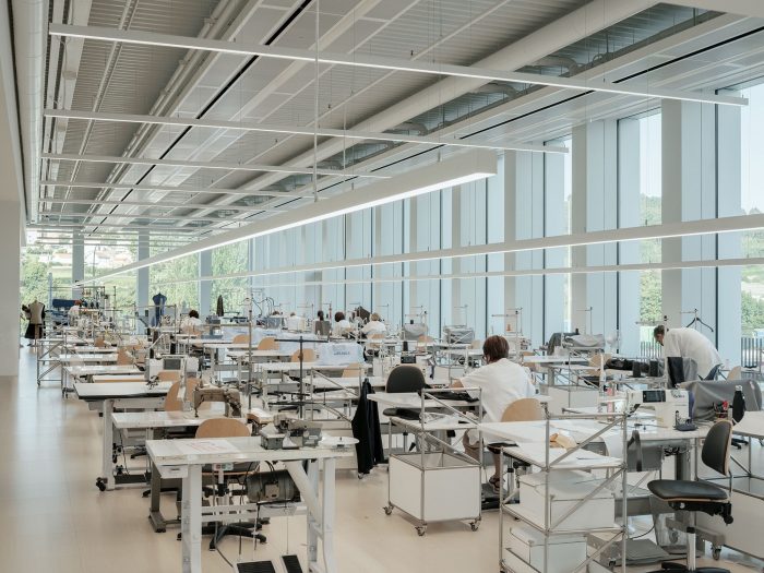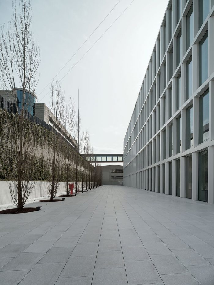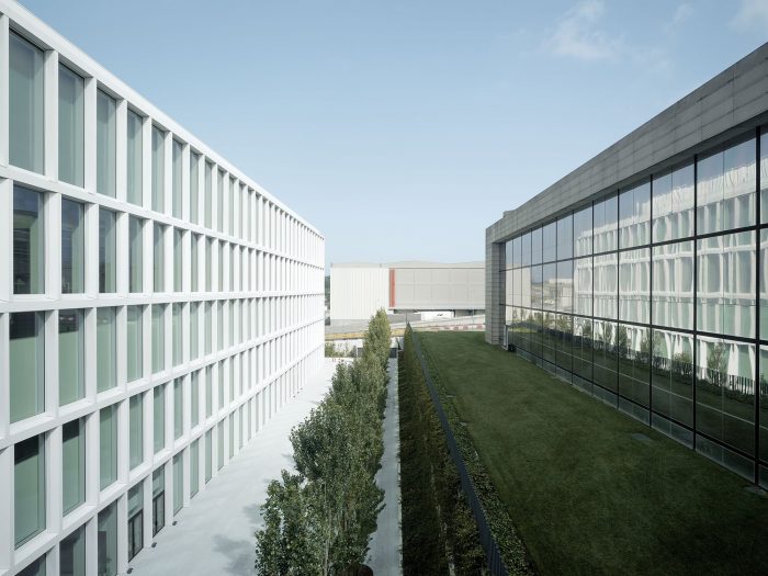 与新建筑的连接是通过一个新的人行道产生的,它完成了一个大型的内部连接轴,并将允许以一种无障碍和非常直观的方式进入新建筑,遵循前几个阶段的逻辑。新建筑由5层90×90米组成,被组织成两个大的自由高度的工作空间,辅以位于工厂一侧和中心的支持和服务空间。这种配置允许产生必要的灵活性,以适应公司目前和未来的不同需求。