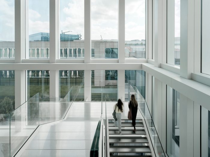 For a better internal connection, the five floors are connected by wide staircases, promoting healthy mobility within the building. The main staircase develops from a large 32-meter-high vertical atrium flooded with natural light. The fact of generating comfortable stairs, with natural light and placing them in visible spaces encourages their use and therefore the well-being of people, reducing the use of elevators and their corresponding energy consumption.