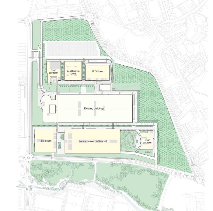 Inditex公司的新扩建项目遵循了最近基于独立体量的建筑群的发展战略,这些体量为人们开发并纳入了有植被存在的室外空间,产生了健康的环境,反过来又使不同的建筑得到了更好的照明条件和自然通风。