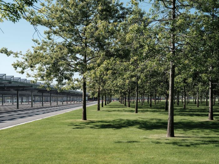 在23000平方米的大面积植被上有350棵树的新森林,提高了空气质量,促进了雨水向现有土地的渗透。这片大面积的绿化使其有可能抵消新建筑建设的大部分二氧化碳足迹,改善空气质量,并有户外运动区。