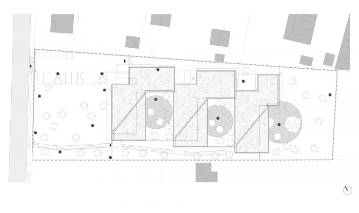 Beyond strengthening the relationship of the site with its history, the massing of the nursery is primarily informed by principles of sustainability, as well as security. The pavilion-style arrangement of the nursery is offset from the street, favoring an introverted sequence of spaces and built elements, which not only creates a range of diverse quality spaces for children to play in, it allows them to do so safely. The buildings on the site have a uniform but whimsical quality, and their layout follows the natural sloping and orientation of the land optimizing solar exposure. The classrooms and their cantilevering canopies are covered with an extensive green roof, thus encircling the private interior playgrounds.