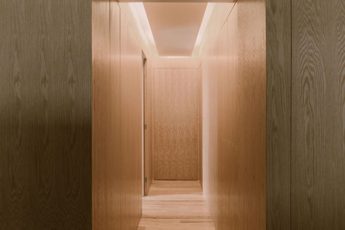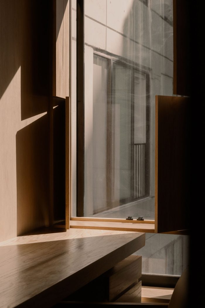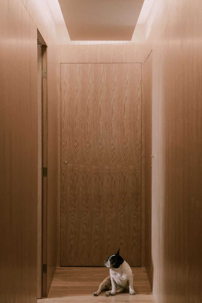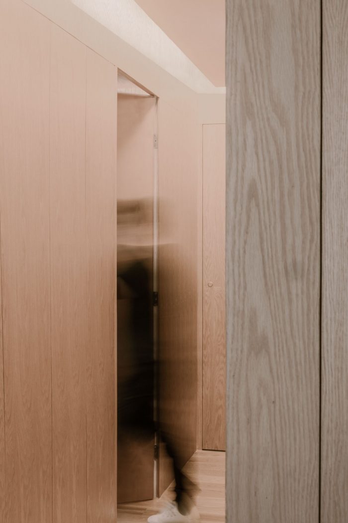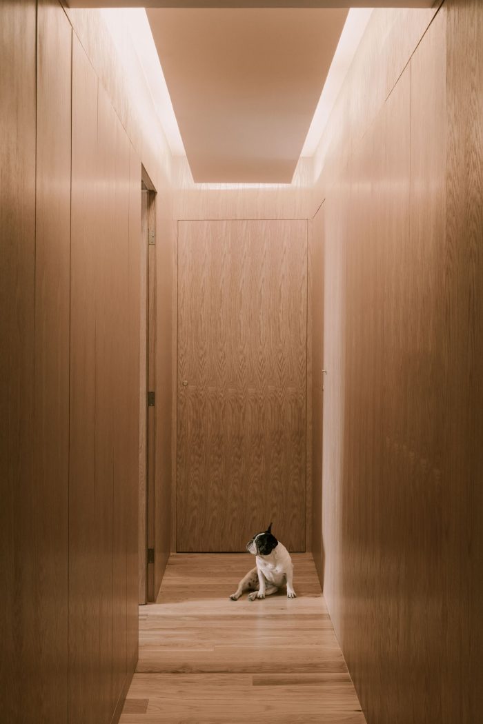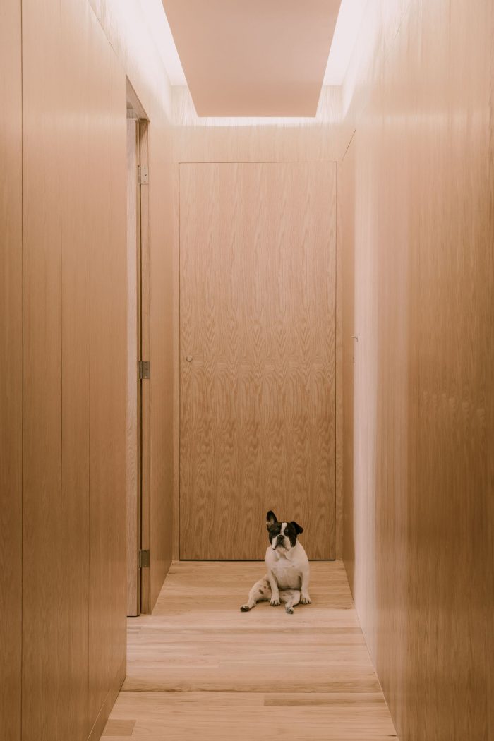 We seek to convey that warmth by bringing more natural light into the room and the use of oak wood and indirect light reflected in warm tones. Through a rectangular window, divided into 4 parts, that lets through a beam of light that forms a cross into Dana’s bedroom. The inhabitants are a family of four, a teenager and only child, Dana, her parents, and Rita, the French bulldog. They find moments of spirituality with the passage of natural light filtered through these 4 panels and serenity with the use of wood through a simple language.
