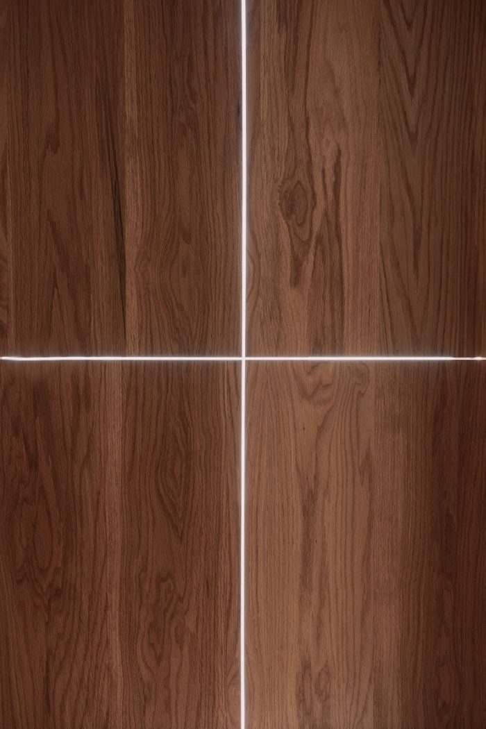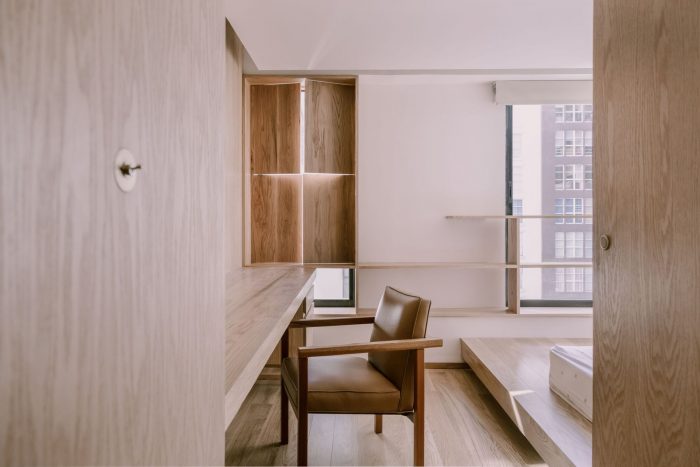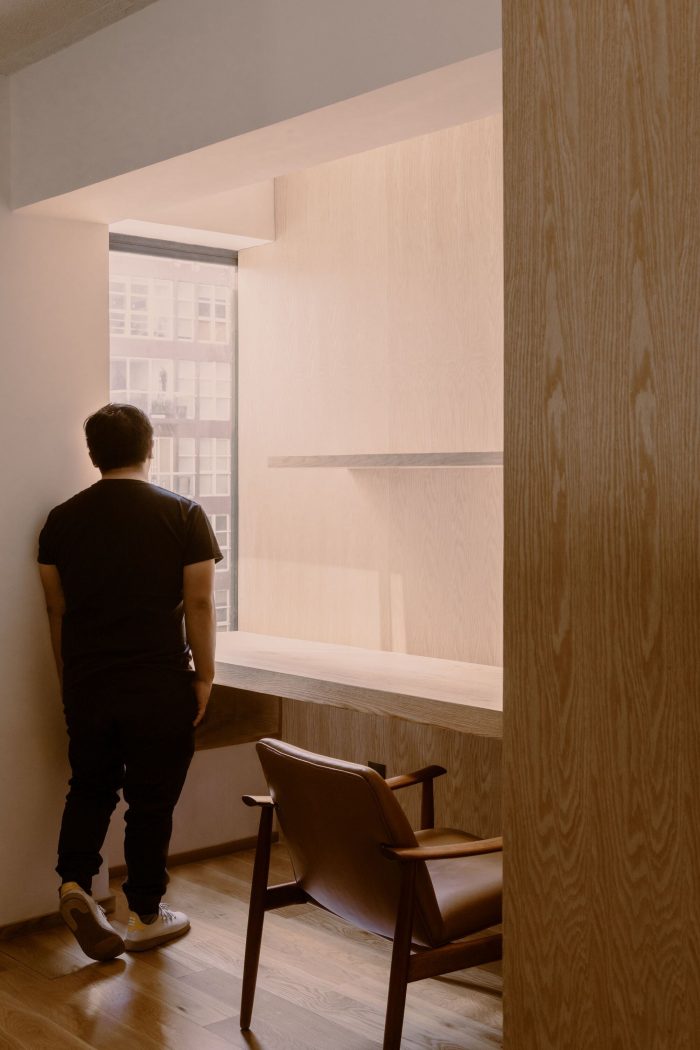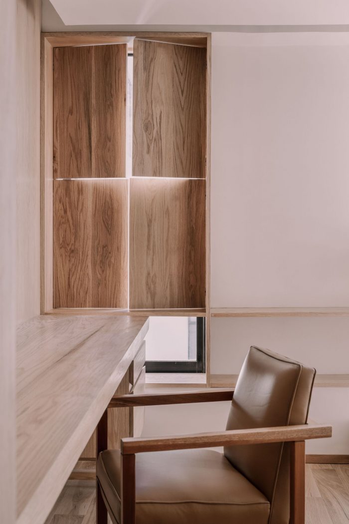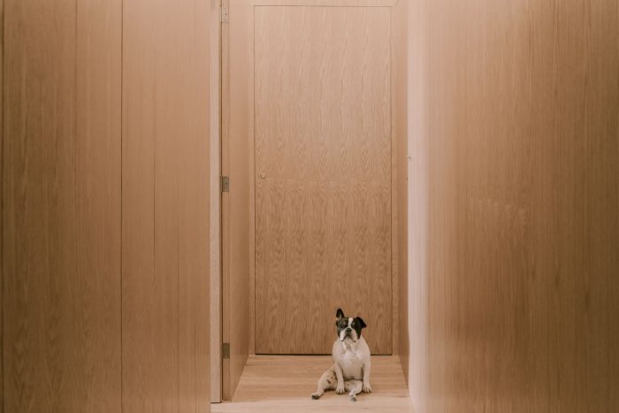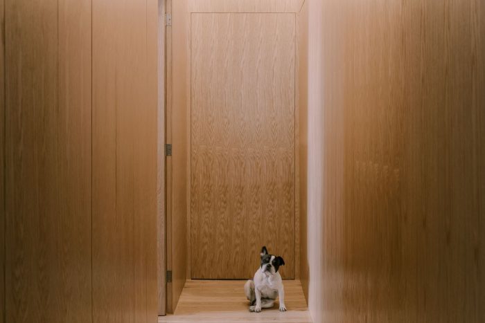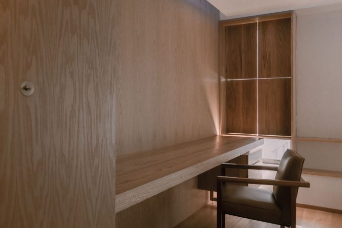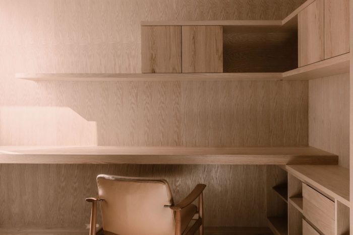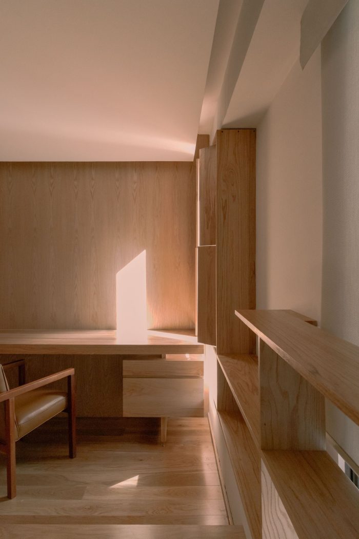 We seek to convey that warmth by bringing more natural light into the room and the use of oak wood and indirect light reflected in warm tones. Through a rectangular window, divided into 4 parts, that lets through a beam of light that forms a cross into Dana’s bedroom. The inhabitants are a family of four, a teenager and only child, Dana, her parents, and Rita, the French bulldog. They find moments of spirituality with the passage of natural light filtered through these 4 panels and serenity with the use of wood through a simple language.