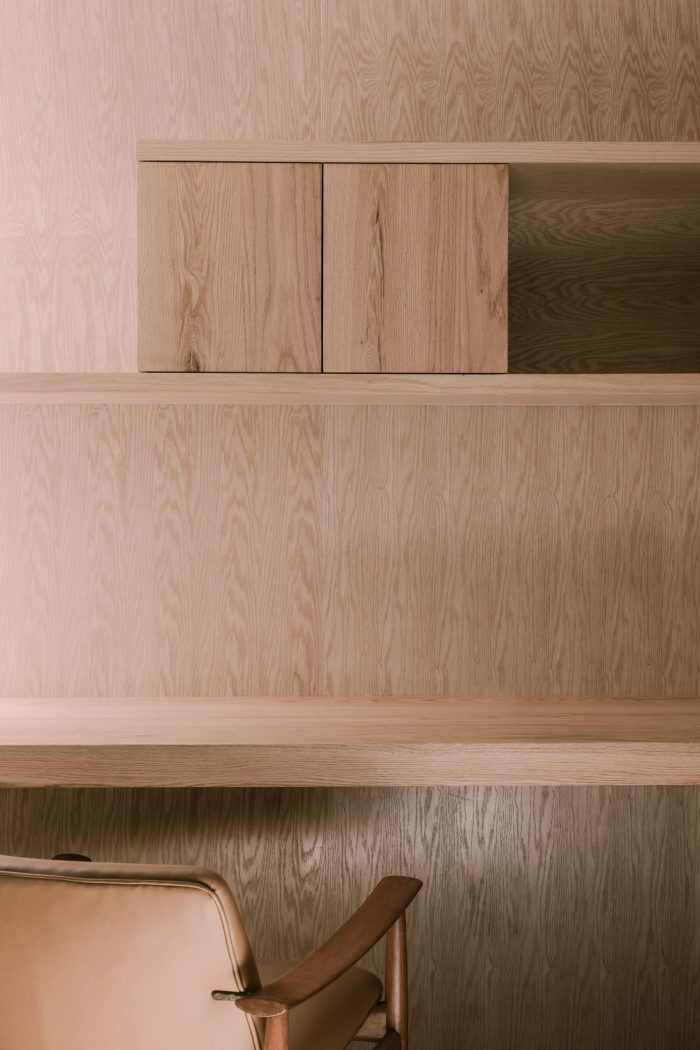 我们试图通过将更多的自然光引入房间,以及使用橡木和暖色调反射的间接光来传达这种温暖。通过一个长方形的窗户,分为4个部分,让一束光形成一个十字架进入丹娜的卧室。这里的居民是一个四口之家,一个十几岁的独生子,丹娜,她的父母,和法国斗牛犬丽塔。他们通过这4块板子过滤的自然光找到了灵性的时刻,通过简单的语言使用木材找到了宁静。